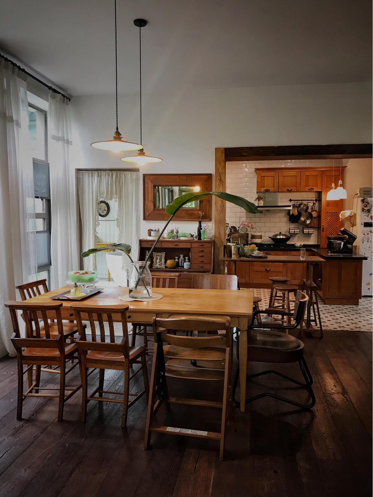 一楼原本是传统的客厅、餐厅、厨房各自隔开。我们全部打通,做成开放式的公共区域。客厅和餐厅之间没有墙,只用一张长桌作为自然的过渡。孩子筐筐可以在家里来回奔跑、滑滑板、搭积木,整个一楼成了他的“隐形游乐场”。