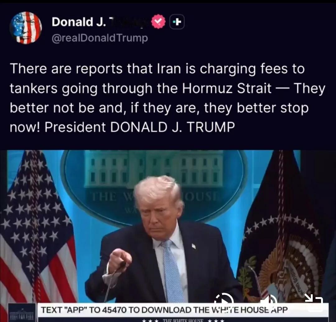特朗普说:“该由美国而不是伊朗对通过(霍尔木兹)海峡的船只征收通行费。”