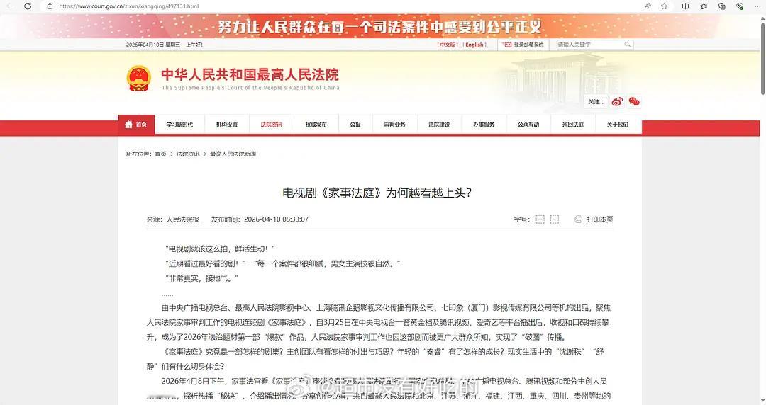 最高法官网发文《家事法庭》认证“收视和口碑持续攀升”“2026年法治题材第一部‘