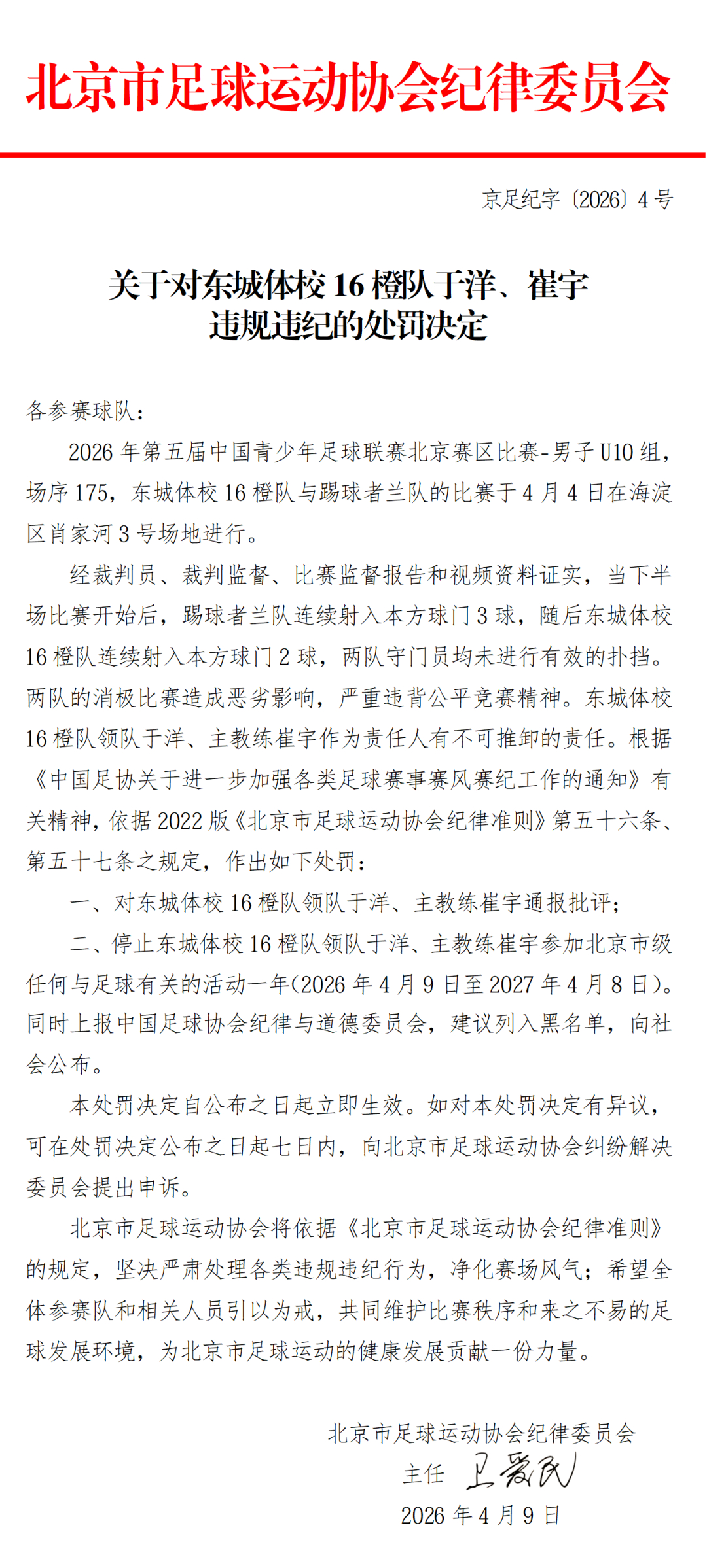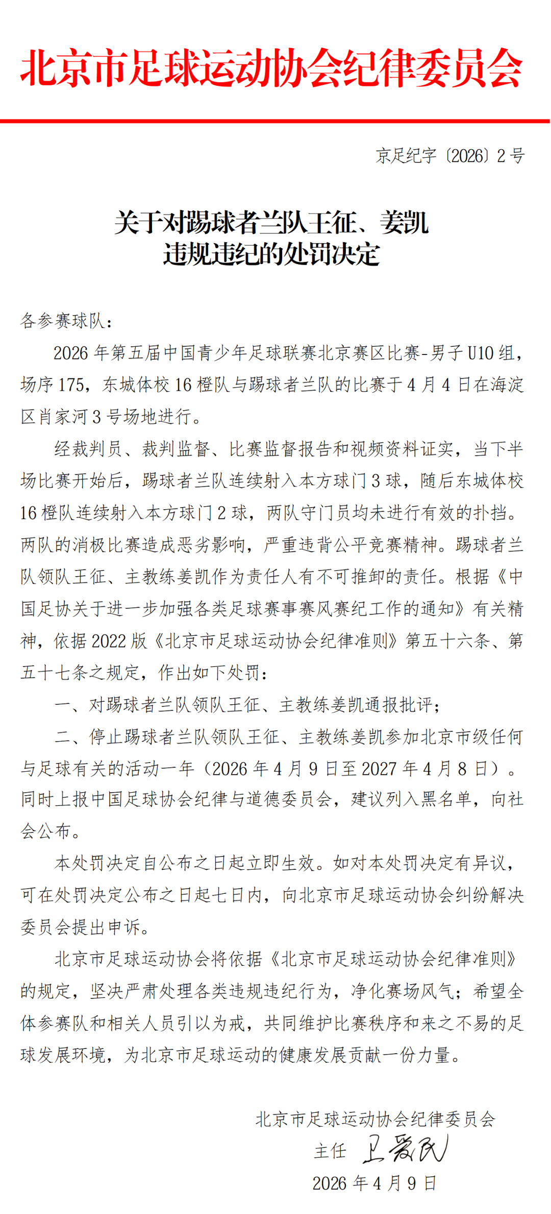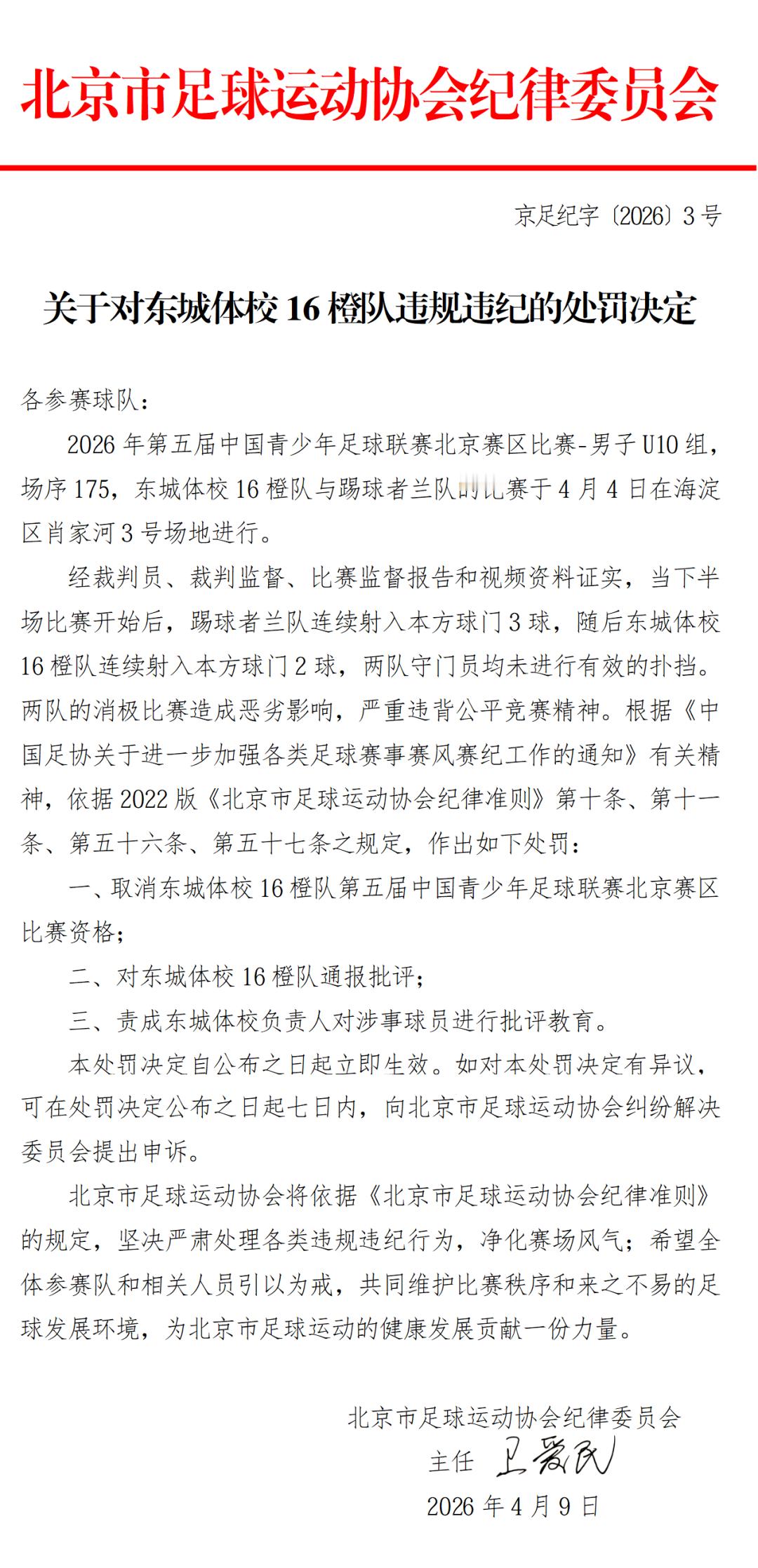 教10岁孩子踢假球?中青赛互射自家球门,教练领队禁赛一年。北京足协公告:在东城体