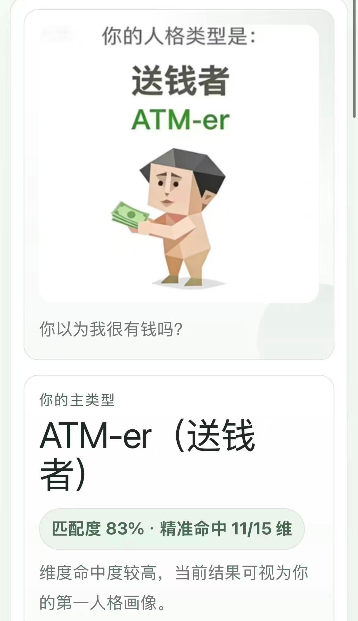 钟辰乐网速也太快了,紧跟潮流测 SBTI,喜提 ATM-er 送钱者类型,并称赞