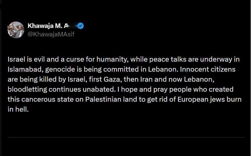 巴基斯坦防长公开表态,称以色列是人类的祸患与诅咒,在巴基斯坦积极推动和谈之时,黎巴嫩却遭到以色列军队实施的种族灭绝行径。以色列此前在加沙制造灾难,随后又针对伊朗,如今又将魔爪伸向黎巴嫩。他还表示,那些在巴勒斯坦领土上建立起这个如同毒瘤一般国家的人,理应在地狱中腐朽消亡。