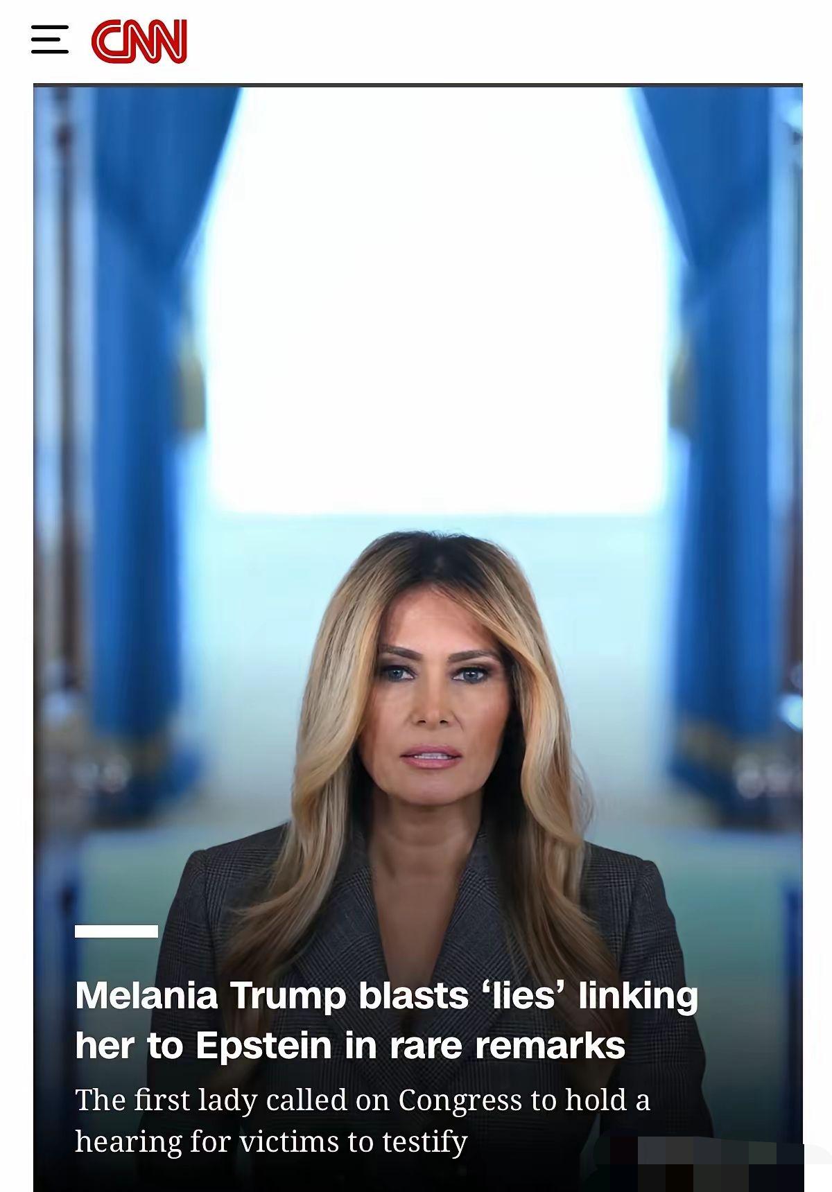 周四,第一夫人梅拉尼娅在白宫罕见地抨击了“将她与可耻的爱泼斯坦联系起来的谎言”,她试图与被定罪的性犯罪者保持距离。同时,她呼吁国会举行公开听证会,允许其的受害者在国会山作证。