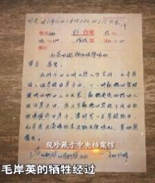 电报原文:“我们今日七时已进入防空洞,毛岸英同三个参谋在房子内,十一时,敌机四架经过时他们四人已出来,敌机过后他们四人返回房子内,忽又来敌机四架,投下近百枚燃烧弹,命中房子,当时有二名参谋跑出,毛岸英及高瑞欣未及跑出被烧死,其他无损失。”