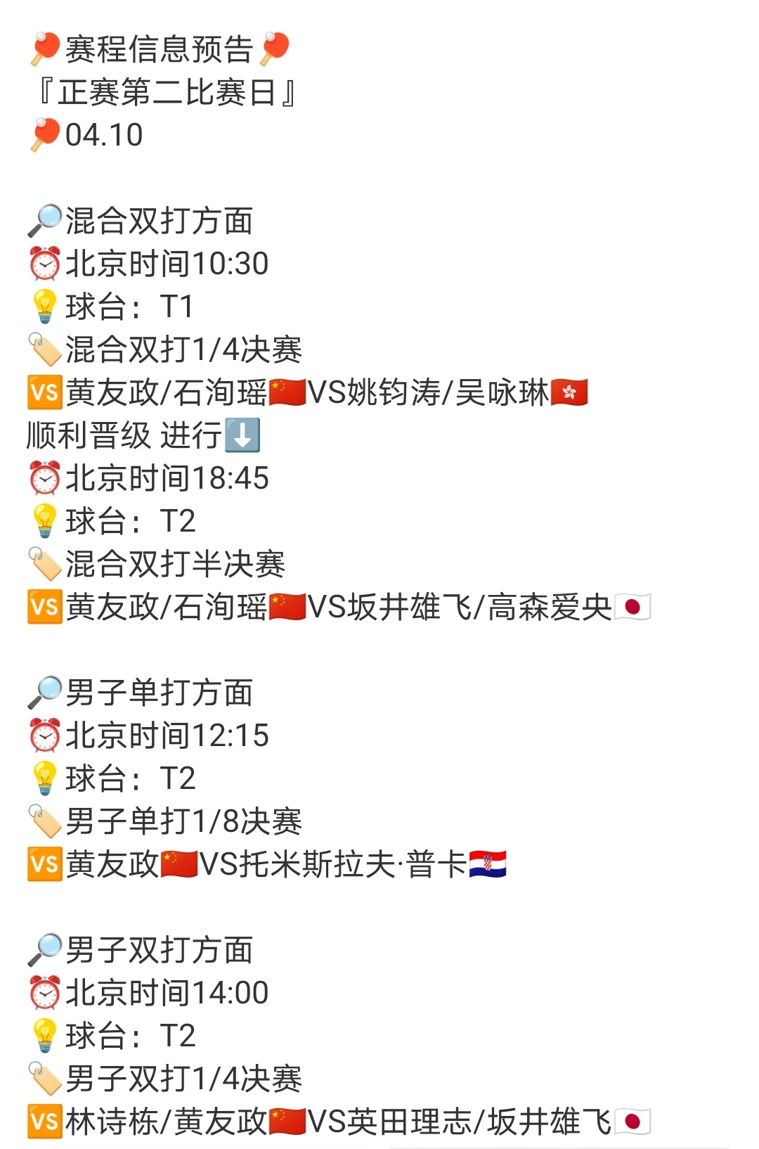 🏓赛程信息预告🏓新增赛程『正赛第二比赛日』🏓04.10