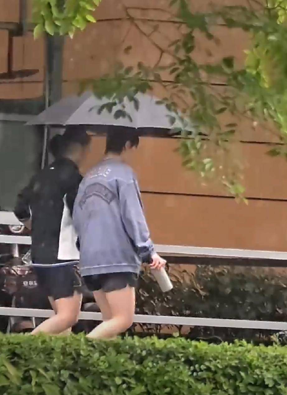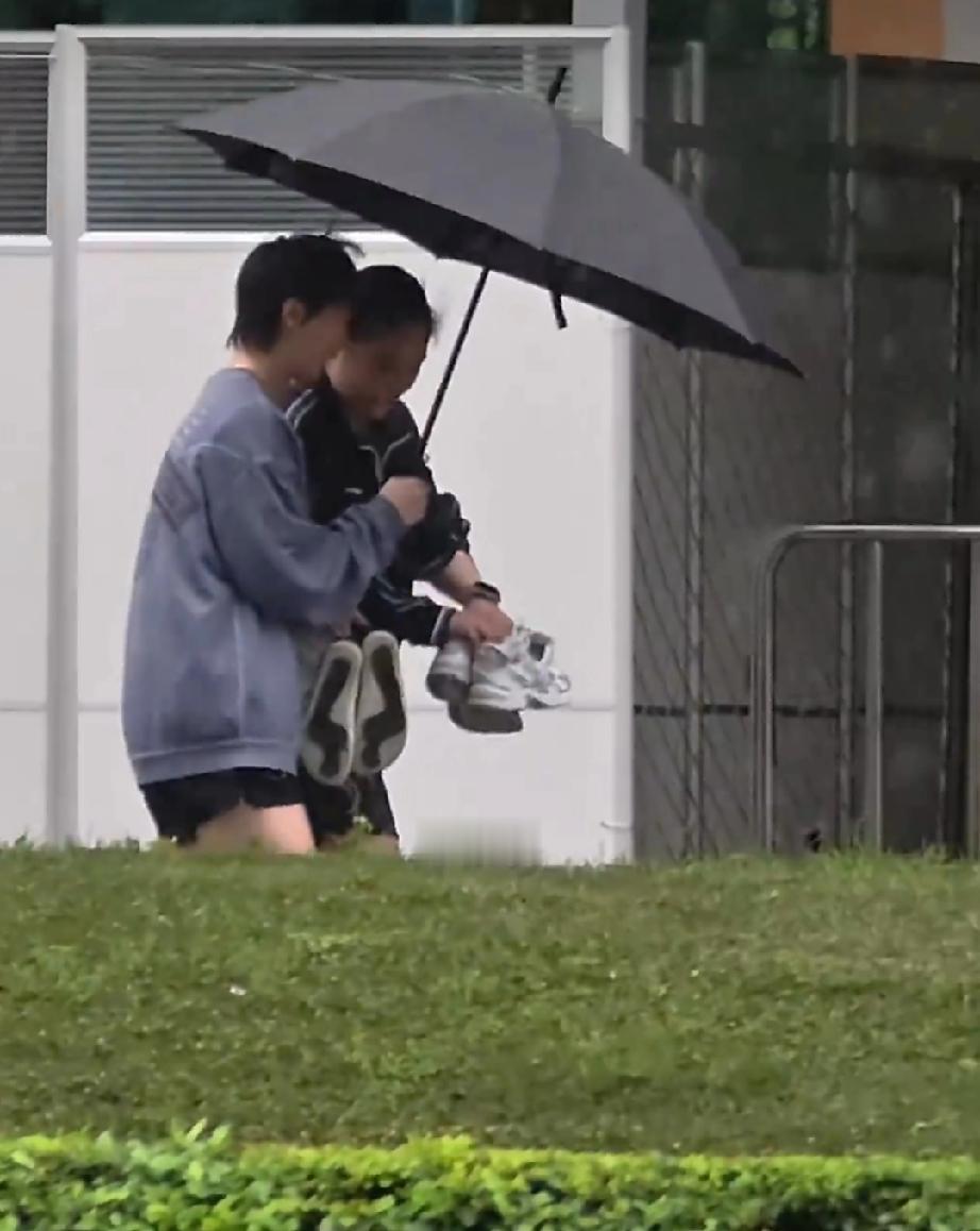 一开始是曼昱举着伞,等徐奕钻进伞里。两个人还手拎着自己的运动鞋,不想被大雨直接打湿。