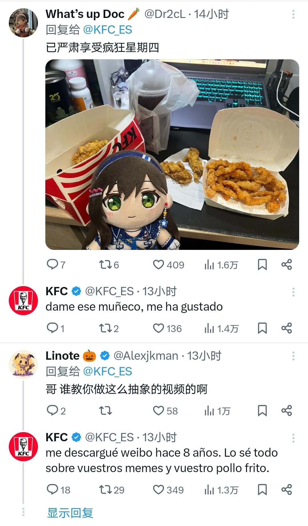 西班牙肯德基官推,8 年前就注册了微博,现在直接把 “疯狂星期四” 嵌进西班牙语推文里,还跟中国网友对线 “哥谁教你做这么抽象的视频”。更让我懵的是,卡戴珊家的 “Keep Rich Stay Slay” 配上了 “丰盛富足”,跟金炸鸡、钱袋摆在一起。