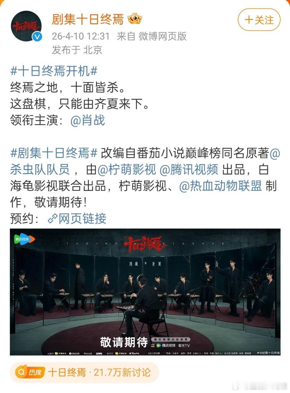 肖战十日终焉台词首发阵容来了,官博第一条、第二条全是肖战,肖战全排在第一,这领头羊