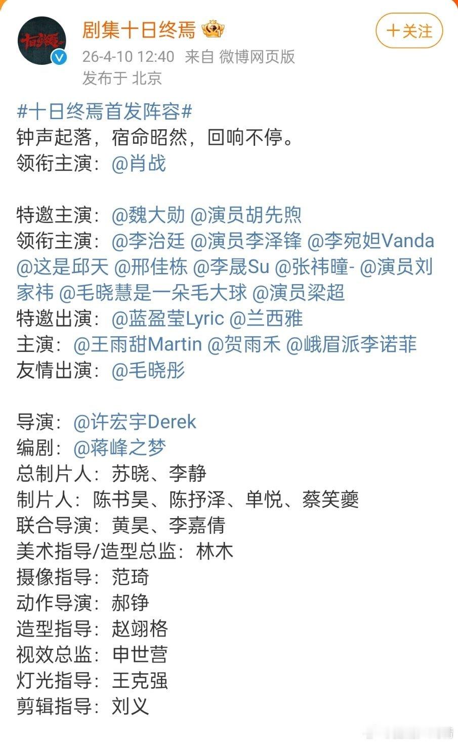 肖战十日终焉台词首发阵容来了,官博第一条、第二条全是肖战,肖战全排在第一,这领头