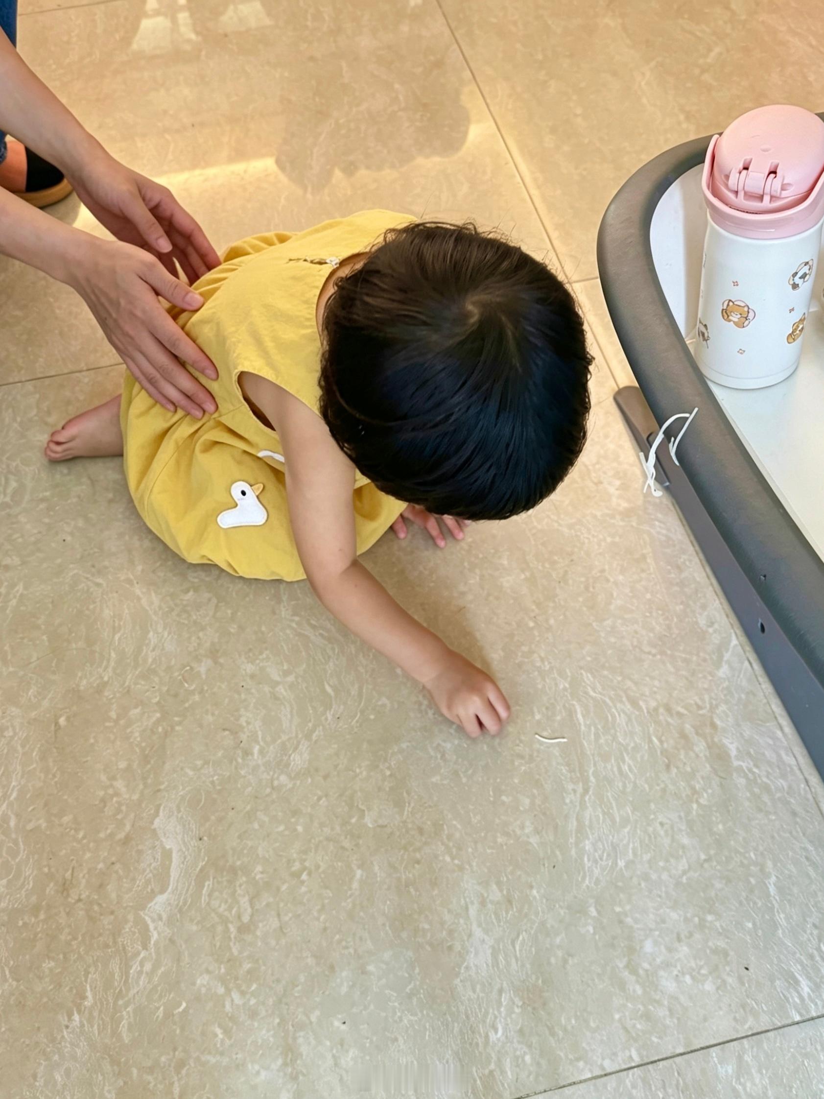 球把面条扔地上,旅蛙让她捡起来球捡起来就往嘴里塞,旅蛙就看着她吃