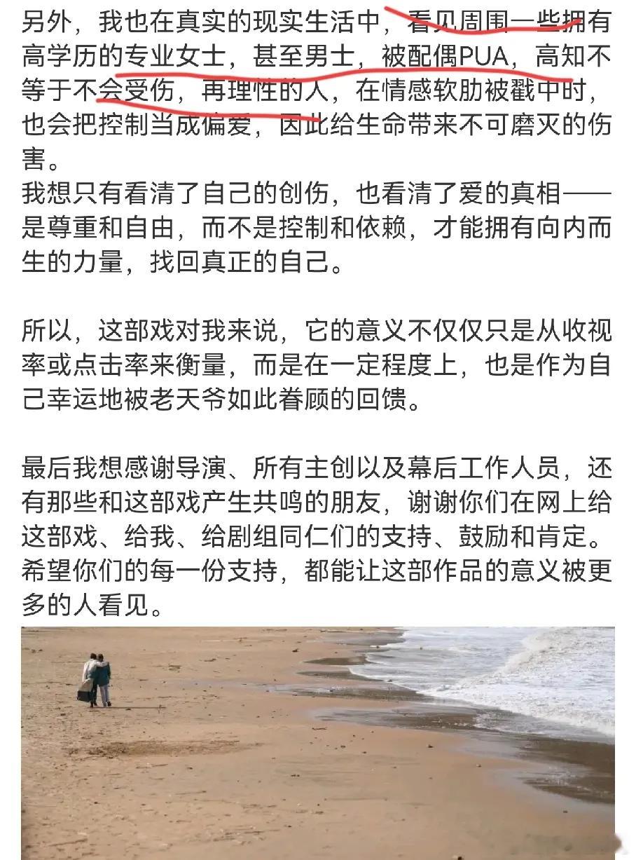 身为妈妈,她想通过《危险关系》这个剧本,给女儿一份保护,让孩子远离伤害。作为女性,她看到现实里不少高学历的女生,甚至男生,都在被伴侣PUA,希望大家能以旁观者视角看清真相。