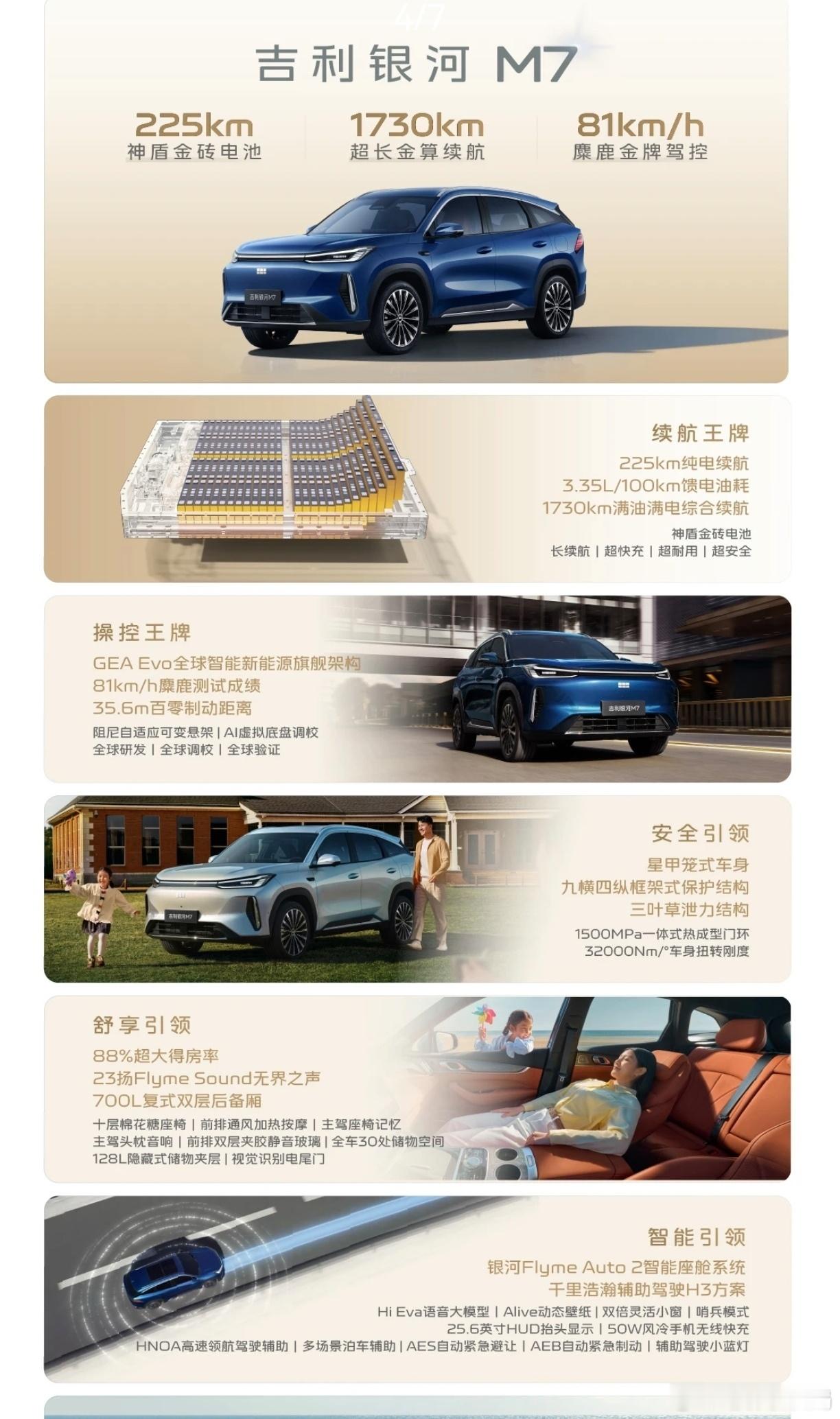 有人说家用车买的太早真不行,今天算是明白了。咱们大部分中国家庭买车讲求“一车多用”嘛,毕竟得考虑家里人。所以大部分普通家庭的选车区间基本都在10万级别的SUV上。早些年相比同价位的轿车,SUV车型其实在动力跟操控上都是有所妥协的。但现在某些品牌的SUV却直接说:我都要!就比如昨天正式开启预售的吉利银河M7,13.98万元的预售价也比较亲近普通家庭。但要只是价格亲民也就没必要说。关键这几个地方我觉得还是值得跟大家唠唠的。插混的动力,225km纯电续航+1730km综合续航+3.35L馈电油耗 。能做到这样的表现主要还是它首发搭载的神盾金砖电池,配备了同级别最大的29.8kWh混动专用电池包。短途代步跟长途续航可以说是都兼顾到了。另外就是它的操控,麋鹿测试成绩81km/h, 放在之前你敢想吗?当然,能做到这个成绩关键还是银河M7舍得下本:比如和中汽研联合开发的AI虚拟底盘调校技术、阻尼自适应可变悬架等等。安全方面不用多说,毕竟有沃尔沃的基因在里面。作为家庭用车,那空间自然得够用。银河M7是88%的得房率,最大可扩展至近2000L的后备箱空间。还有Flyme Auto 2智能座舱、Hi Eva语音大模型、千里浩瀚的辅助驾驶H3方案等等。不管是空间、智能化、辅助驾驶等等,基本都没落下。目前是预售价格,正式上市的话价格可能会更低,大家可以关注一下。主流精品电混SUV引领者任贤齐认证的SUV