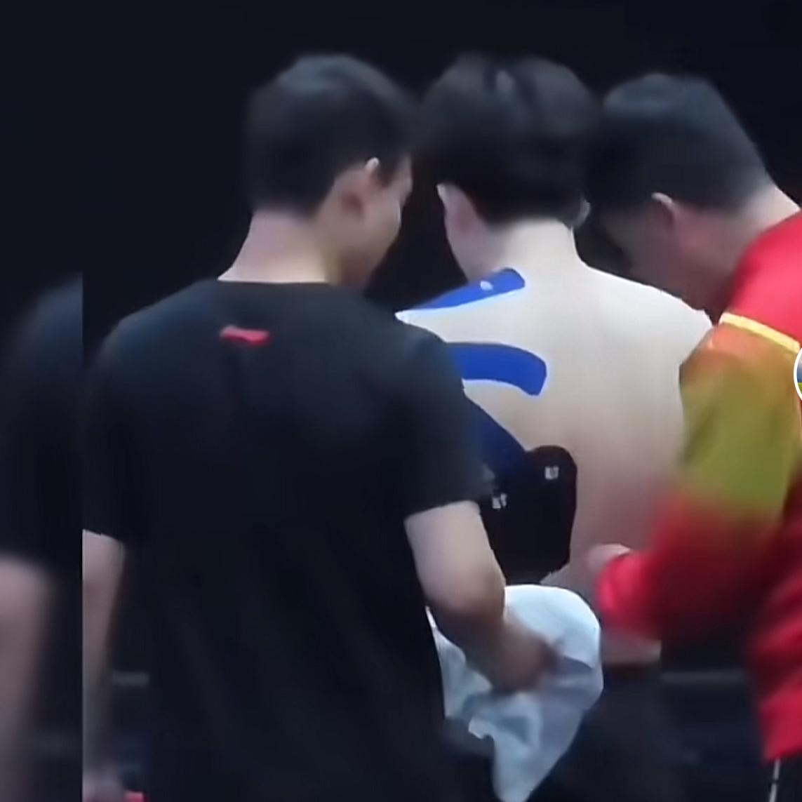 他的左臂膀贴满肌肉贴,