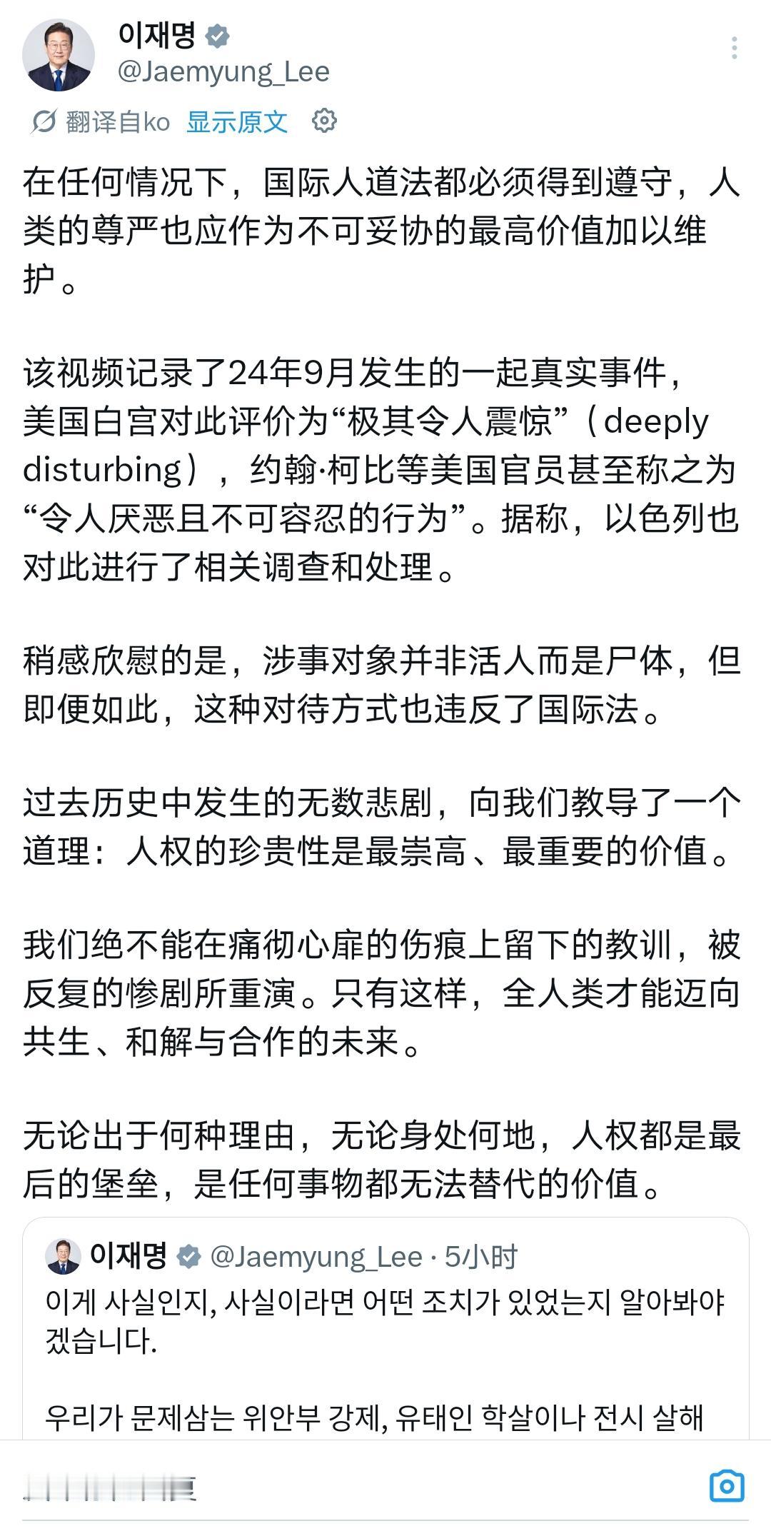以军残暴,以色列对巴勒斯坦人民犯下的是战争罪。联合国大会、人权理事会多次通过决议,谴责以色列行为构成违反国际法——因此,李在明务实地推送这条视频,不仅是谴责,也是响应国际共识。