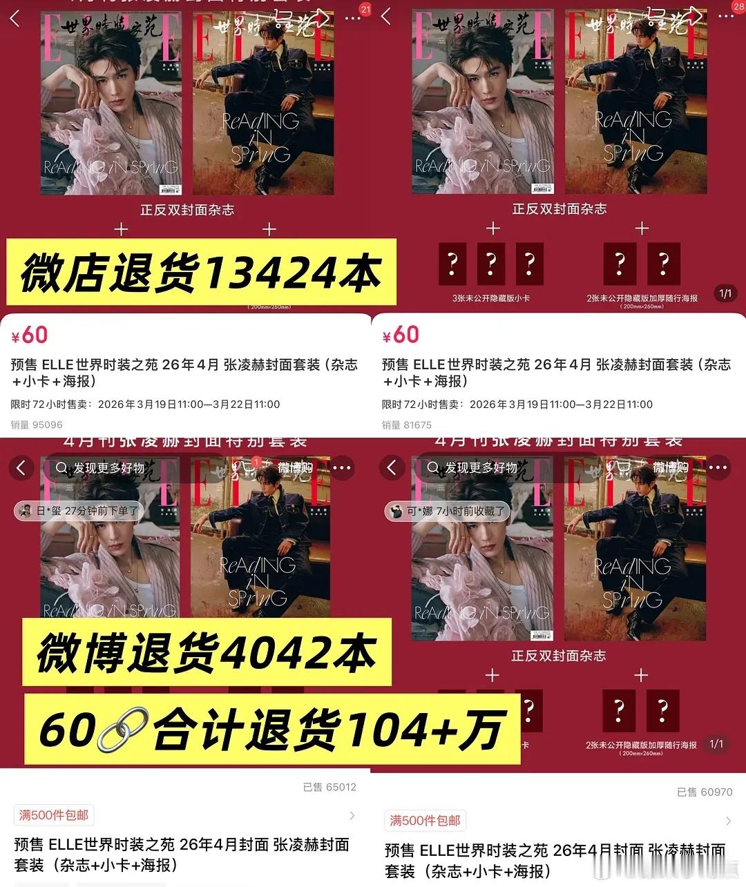 张凌赫 ELLE杂志60单🔗外显直接掉一万七千本 销量差异104万+😯退了