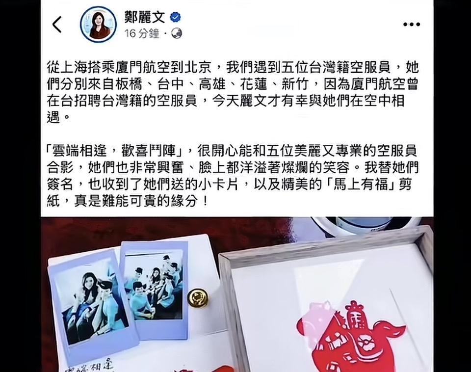 在航班上,郑丽文惊喜地遇到了五位台湾籍空乘,她们分别来自板桥、台中、高雄、花莲、新竹,是厦航多年来赴台招聘、为台湾青年提供就业机会的见证者。机舱内,五位身着厦航制服的空乘难掩兴奋,主动与郑丽文合影留念,镜头里的她们笑容灿烂,满是同乡相见的亲切与欢喜。郑丽文不仅为她们签名,还收到了精心准备的小卡片与“马上有福”剪纸,这份双向奔赴的温暖,让万米高空充满了融融暖意。