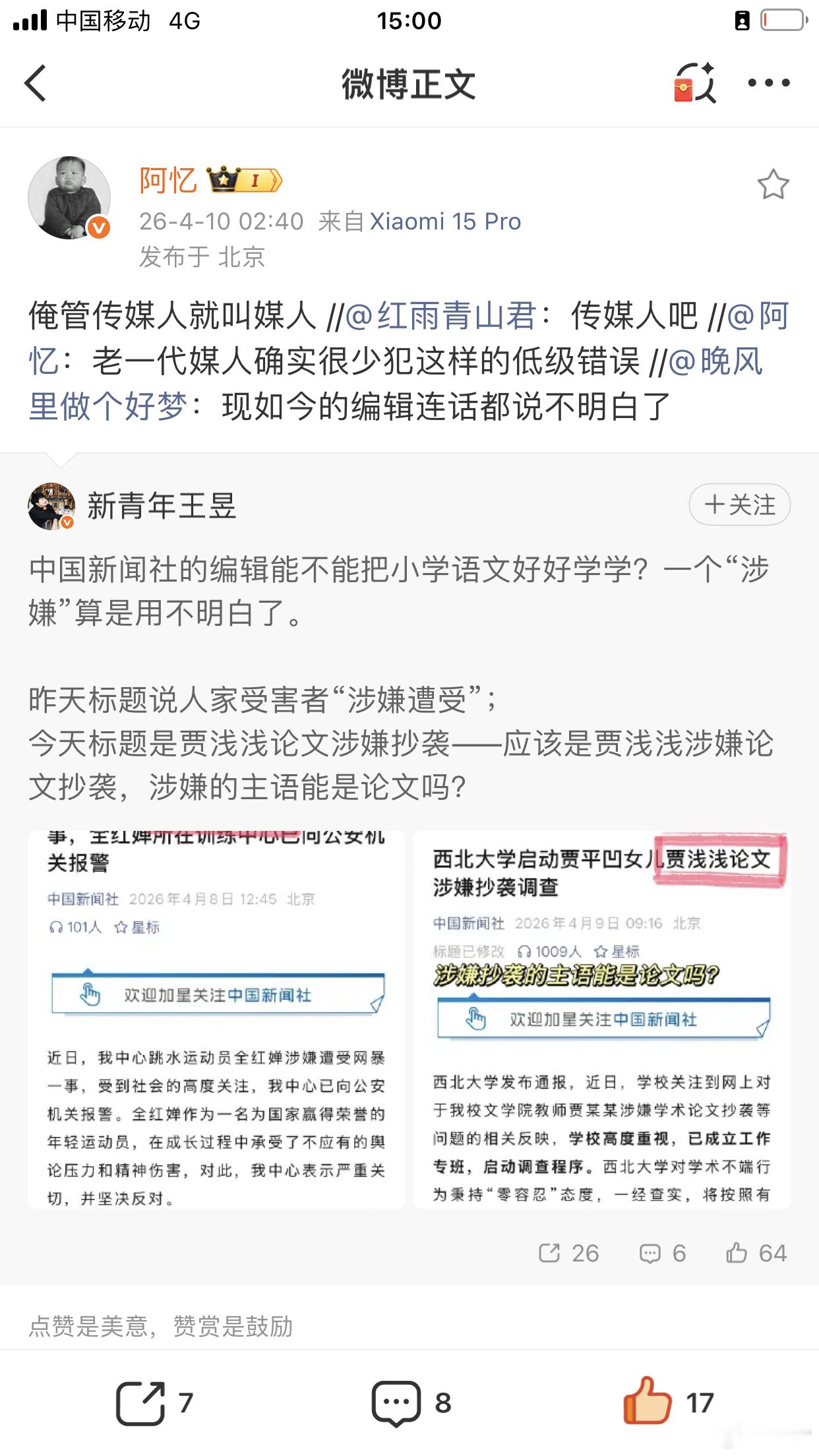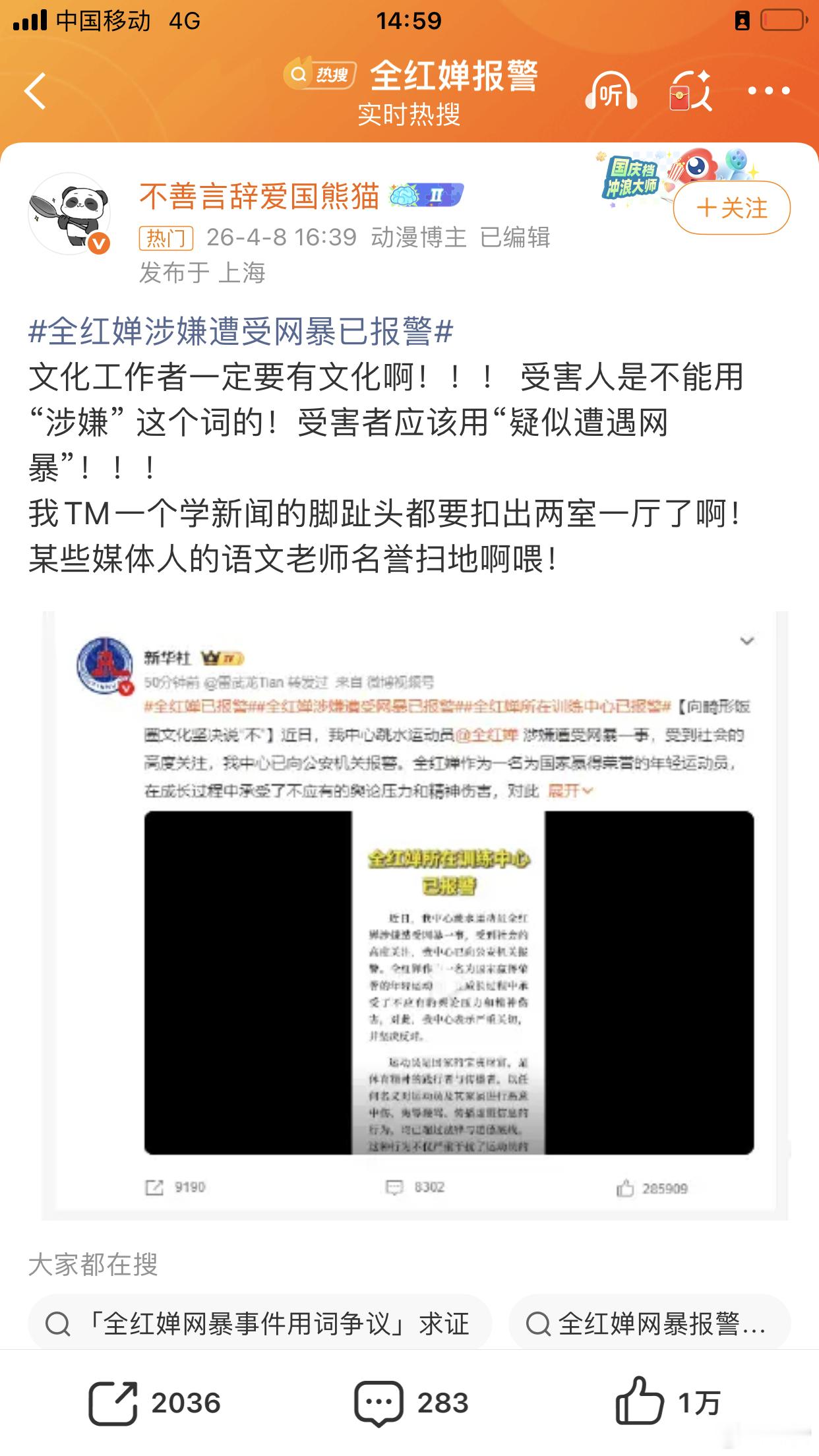 全红婵涉嫌遭受网暴已报警有好多好朋友、教授指责“涉嫌”两个字糟糕透了,新华社、中新社小编不懂汉语,没上过中学,我虽然56岁最高学历中专,高考落榜但数学接近满分,但是【事实、报道、舆论】这个现代社会现实世界三元素一键生成的感性框架提出者,我想说,在这个框架里,这个表述已是最优解。同时,1通讯社只是转述,2是广东跳水中心首发,3删掉涉嫌,报道与事实相符不?4改成疑似,难道与事实更接近还是更远?5涉嫌用法,骂的人都知道是元素二的语法,无人质疑通讯社与跳水中心的立场,这哪道不是与事实更近?