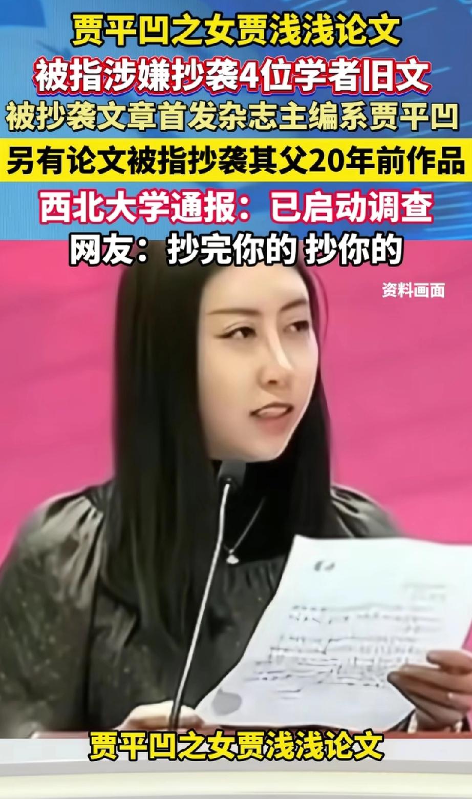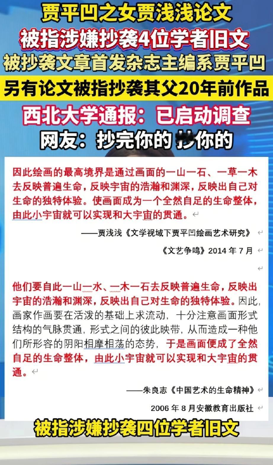 4月9日西北大学官网发通报,要调查文学院教师贾某某涉嫌学术论文抄袭问题。网上早有博主“抒情的森林”爆料,贾浅浅2014年发表在《文艺争鸣》的论文《文学视阈下贾平凹绘画艺术研究》,存在抄袭情况。她把朱良志2006年文章的核心观点“移花接木”来评价父亲贾平凹的画作,论文里对贾平凹画作的描述还与曾令存1997年的文章高度雷同。西北大学表明对学术不端“零容忍”,希望调查能给大众一个真相,维护好学术风气。 贾教授争议