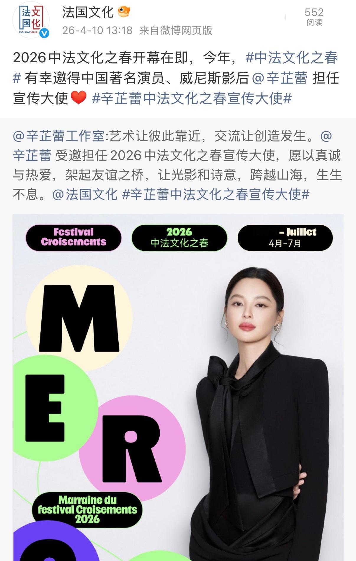 查了一下蕾姐这个是国家级的活动。法国外交部参加的那种法国文化官博:有幸邀得中国著名演员、威尼斯影后担任宣传大使