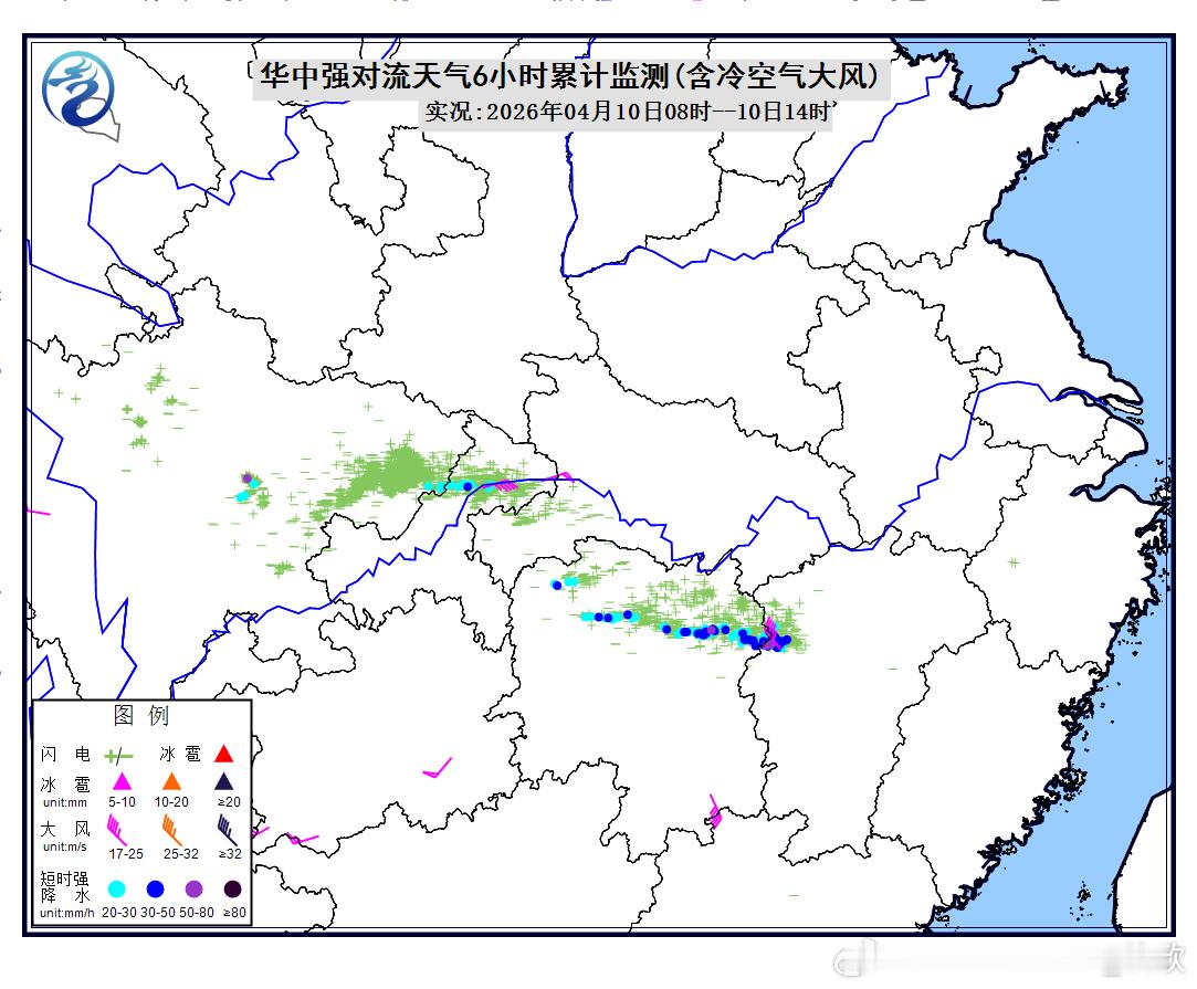 预计4月10日14时至11日14时,江南中西部等地的部分地区将有8级以上雷暴大风或冰雹天气,其中,湖南西南部、江西中部等地的部分地区将有10级以上雷暴大风,最大风力可达11级以上;西南地区东北部、江南等地的部分地区将有小时雨量大于20毫米的短时强降水天气,其中,湖南东部、江西中部等地的部分地区小时雨量大于50毫米。