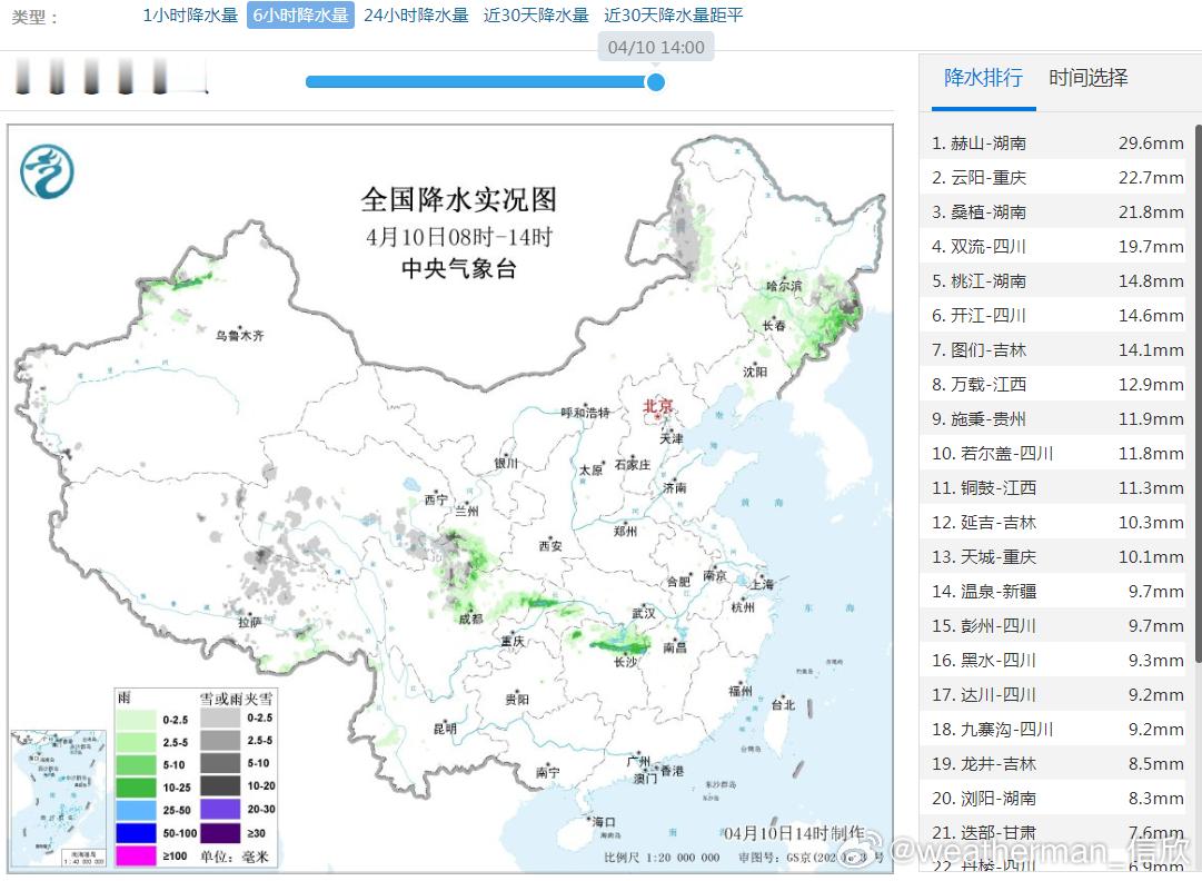 预计,4月10日14时至11日14时,湖南中北部、湖北东南部、江西中北部、安徽南部、浙江中西部及重庆东部、贵州东部等地部分地区有大到暴雨,其中,湖南中部等地局地有大暴雨(100~140毫米)。