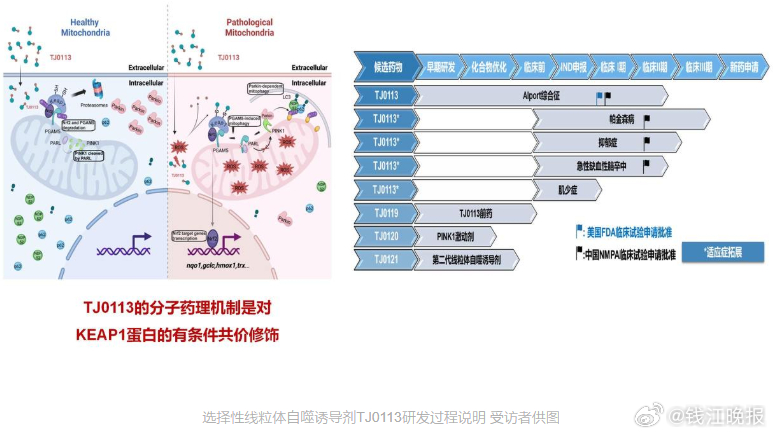 但如果你期待打一针,就能凭空多出几十年的寿命,那很可能会失望。“当前,我们更现实的愿景,是让人有质量地多活8到10年。”夏宏光表示,他的团队正从另一个方向探索抗衰老的路径——身体的“能量工厂”:线粒体。如果把细胞想象成一台精密仪器,线粒体就是它的发动机。夏宏光团队做的,不是替换整台仪器,而是研发一种线粒体口服小分子药物——选择性线粒体自噬诱导剂TJ0113,能够精准清除细胞内老化、受损的线粒体,同时促进健康新线粒体的生成,相当于“给细胞换上一台全新的发动机”。