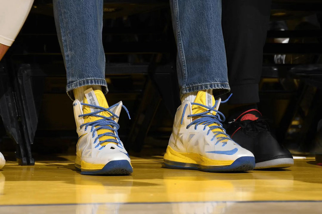 库里穿詹姆斯的鞋库里今天因为伤病管理缺席比赛在比赛中可以看到库里穿着个人专属勇士配色Nike Lebron10 ID在场边观战这双鞋在库里NBA生涯早期也曾上脚也算是致敬老詹和曾经的自己了转眼已经过去十几年感叹时间流逝的同时也希望还能多看几次库里VS老詹NBA