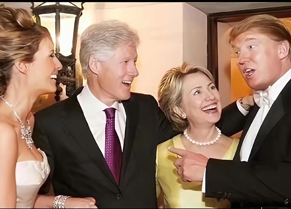 2005年,特朗普与第三任妻子梅拉尼娅婚礼上宴请克林顿夫妇时的一幕,当时特朗普大