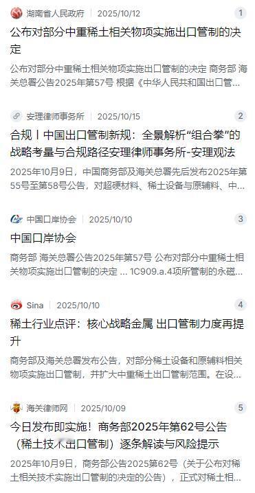 这帮顶风作案的企业很快让国家意识到,光堵出口还不行——境外绕道的漏洞也必须封上。2025年10月9日,商务部发布61号公告,将境外加工产品也纳入出口许可管理。规定很明确:凡在境外产品中含有原产中国的稀土材料,且原产材料占产品总价值比例达到0.1%及以上,境外出口商出口时也必须获得中国商务部的许可证。也就是说,国内企业把稀土磁材卖到国外加工一下再转手出口,这条路被彻底堵死了。同日发布的62号公告还将稀土开采、冶炼分离、磁材制造、二次资源回收利用等全链条技术纳入出口管制。技术也不让出去了,这次是真锁死了。