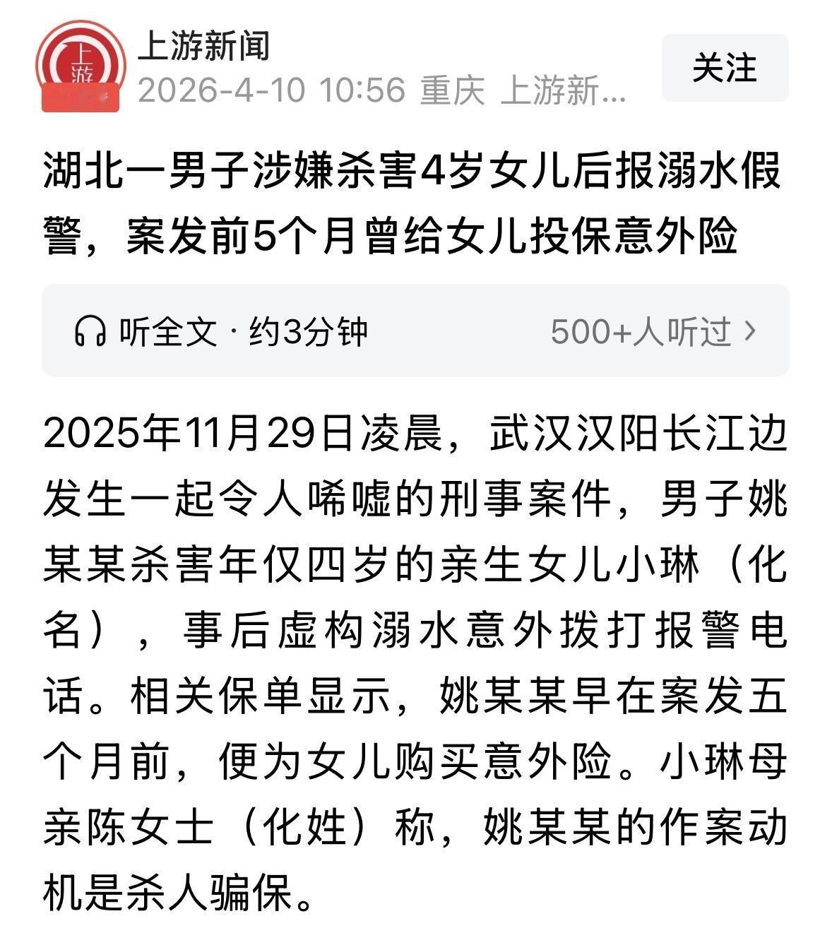 湖北武汉,男子夜里把4岁的女儿带到江边,将女儿头摁入江水中,确定女儿没气后,他把女儿抛进江里,报警说女儿意外溺水了,在外地的妻子得知女儿的死讯后,崩溃不已,她总觉得事情没那么简单,而警方调查后发现,男子在事发5个月前,曾为女儿购买了意外险。