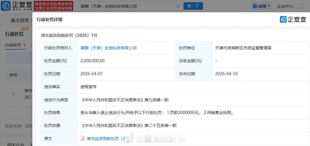 【315曝光外泌体公司灏麟生物被罚200万】315曝光灏麟生物被吊销营业执照 企查查APP显示,近日,被315晚会曝光的灏麟(天津)生物科技有限公司因涉嫌虚假宣传,被天津市滨海新区市场监督管理局罚款200万,并被吊销营业执照。行政处罚决定书显示,经核查,当事人所提供的证据材料无法证明其销售的产品具有宣传所述的功效,属于对所售商品功能进行虚假的商业宣传,该行为对消费者和其他经营者的购买决策产生实质性影响,依法应当认定为虚假宣传违法行为。