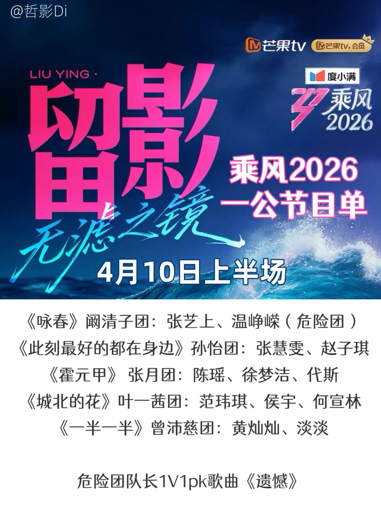 乘风2026一公歌单《乘风2026》一公直播上半场节目单发布,今晚张月团、曾沛慈团、孙怡团、叶一茜团将面对来自阚清子团的挑战。期待直播