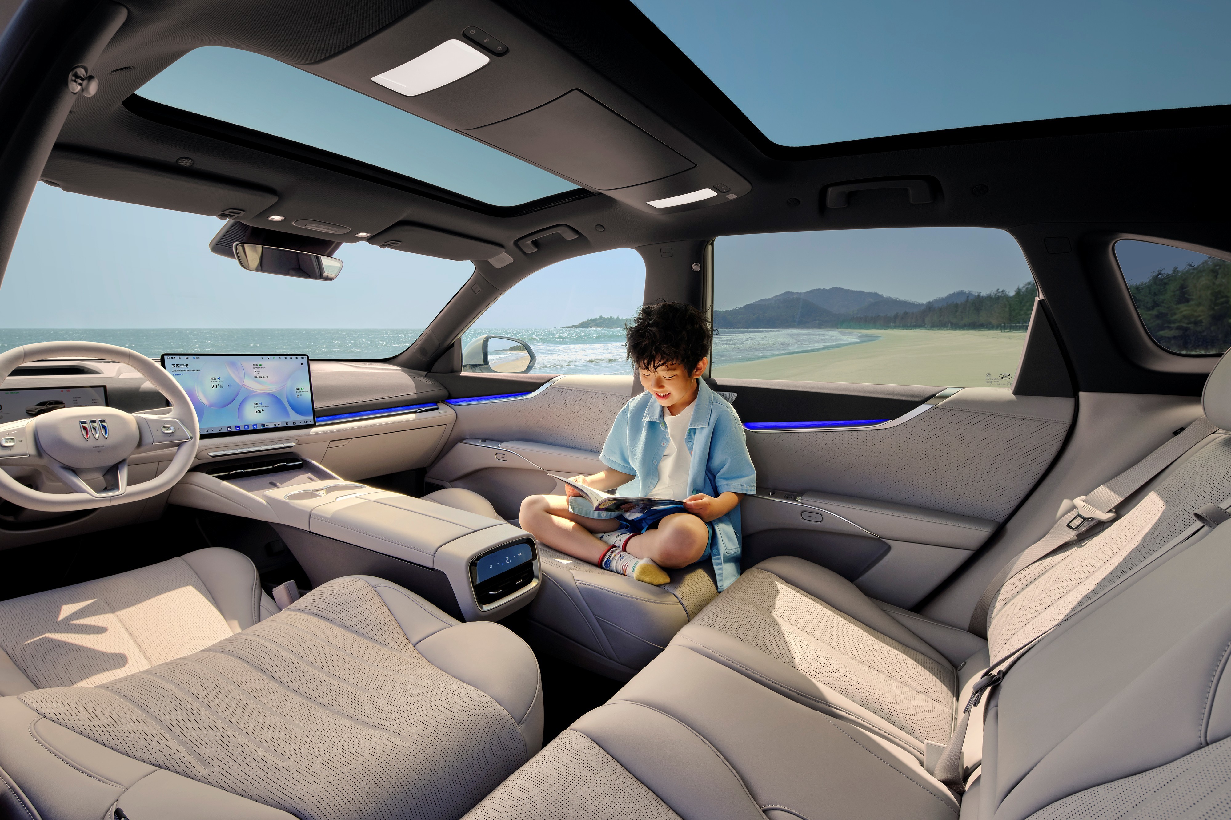 前后都是15.6英寸的大屏,长途旅行不再无聊。配合 杜比 全景声20扬声器 环绕音响,还有车内氛围灯也会跟着音乐变化,简直是把电影院搬进了车内。