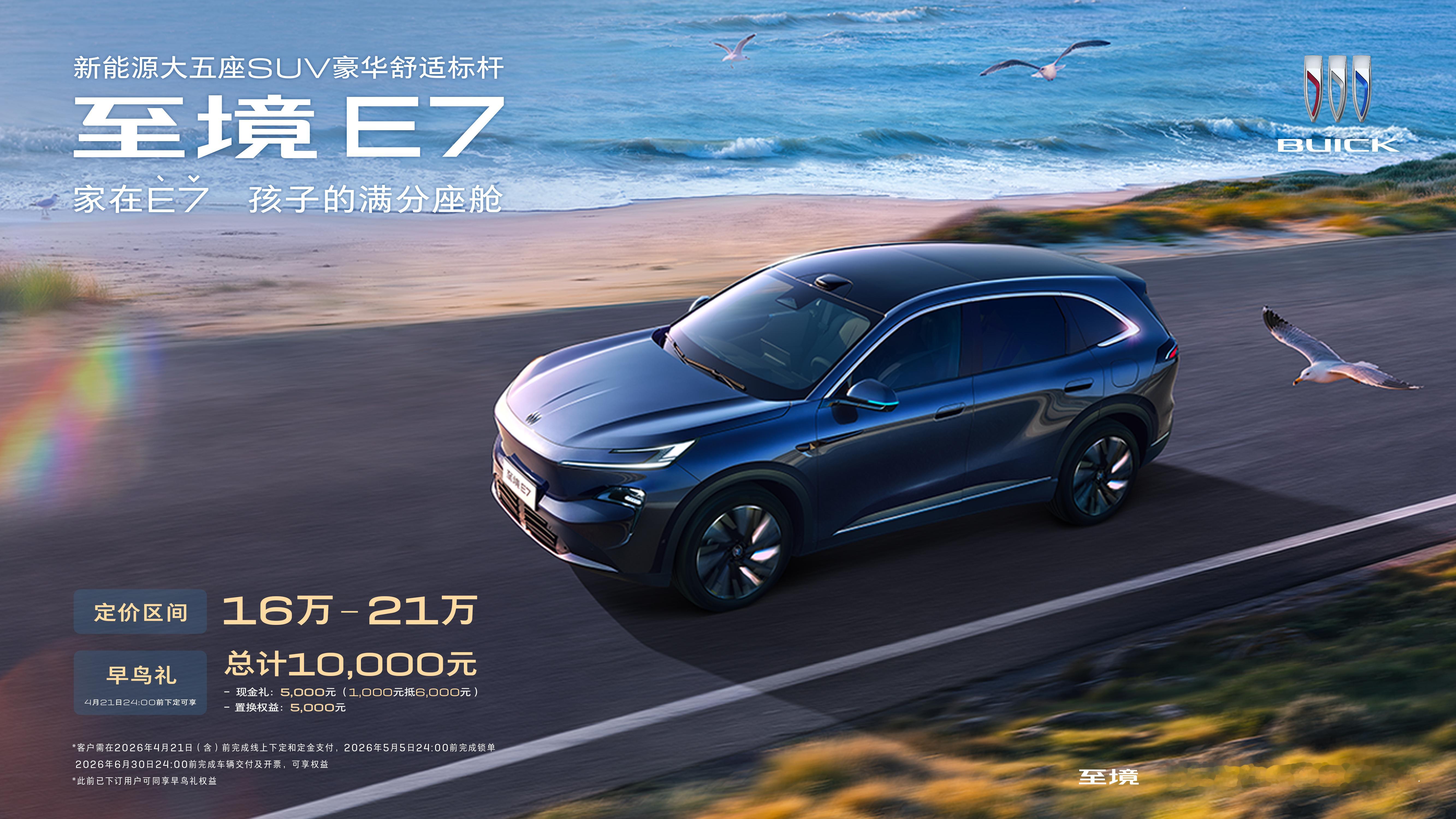 新车情报局 今日,别克高端新能源子品牌至境旗下首款SUV——别克至境E7 公布三款车型配置,均配备真龙插混Pro系统,定价区间为16万-21万元,将于4月22日公布售价并开启交付。即日起至2026年4月21日(含)前,用户完成线上下定,可享早鸟礼总计10,000元;此前已下订用户,可同享该项早鸟权益。接下来再回顾下这款车的新车划重点