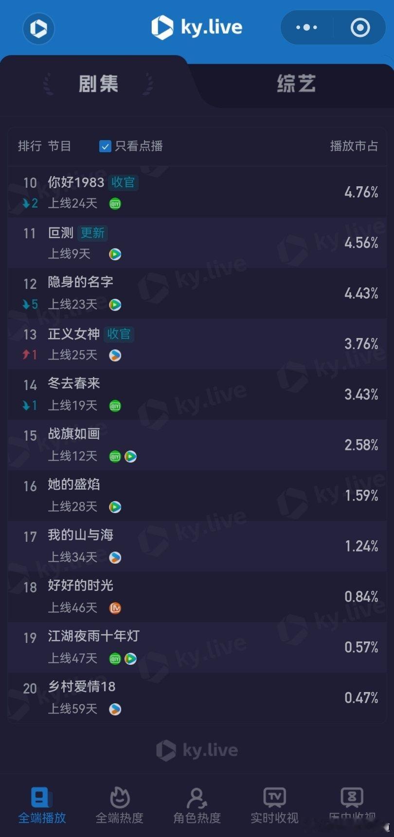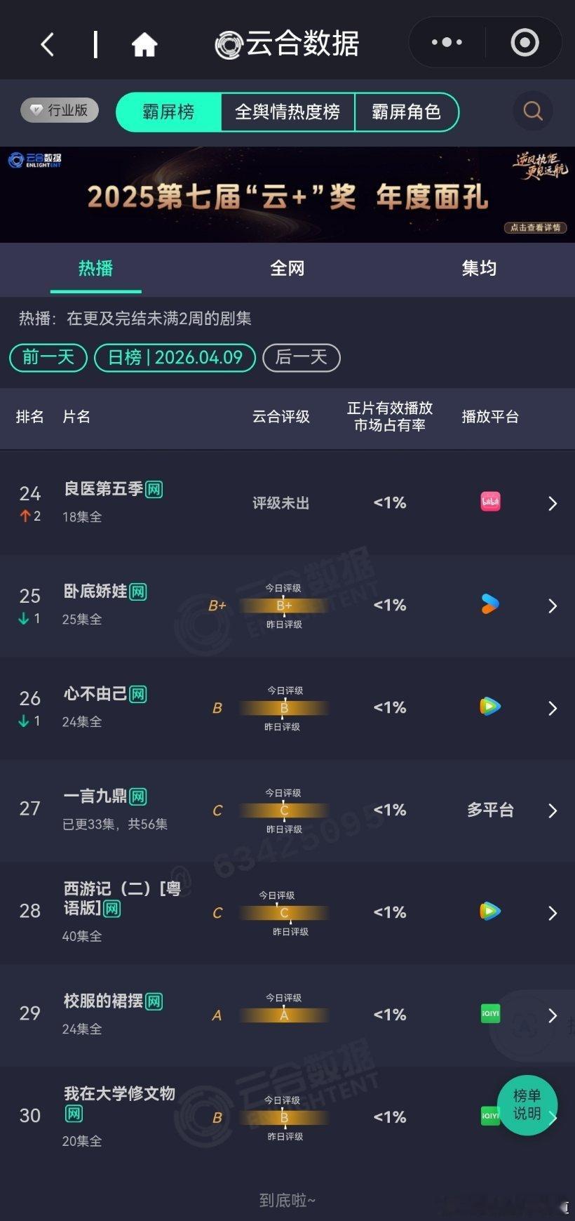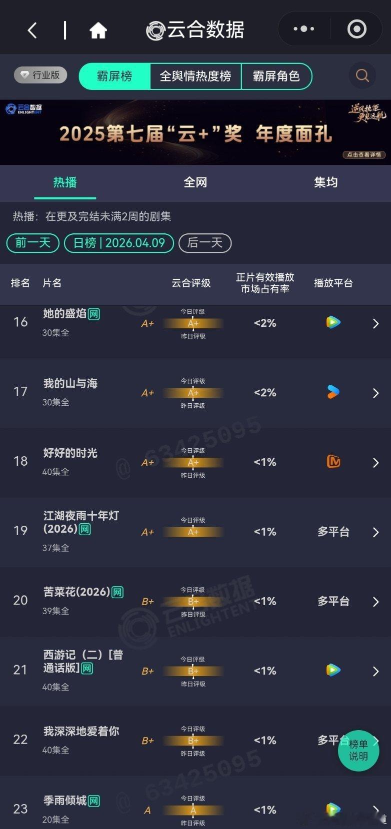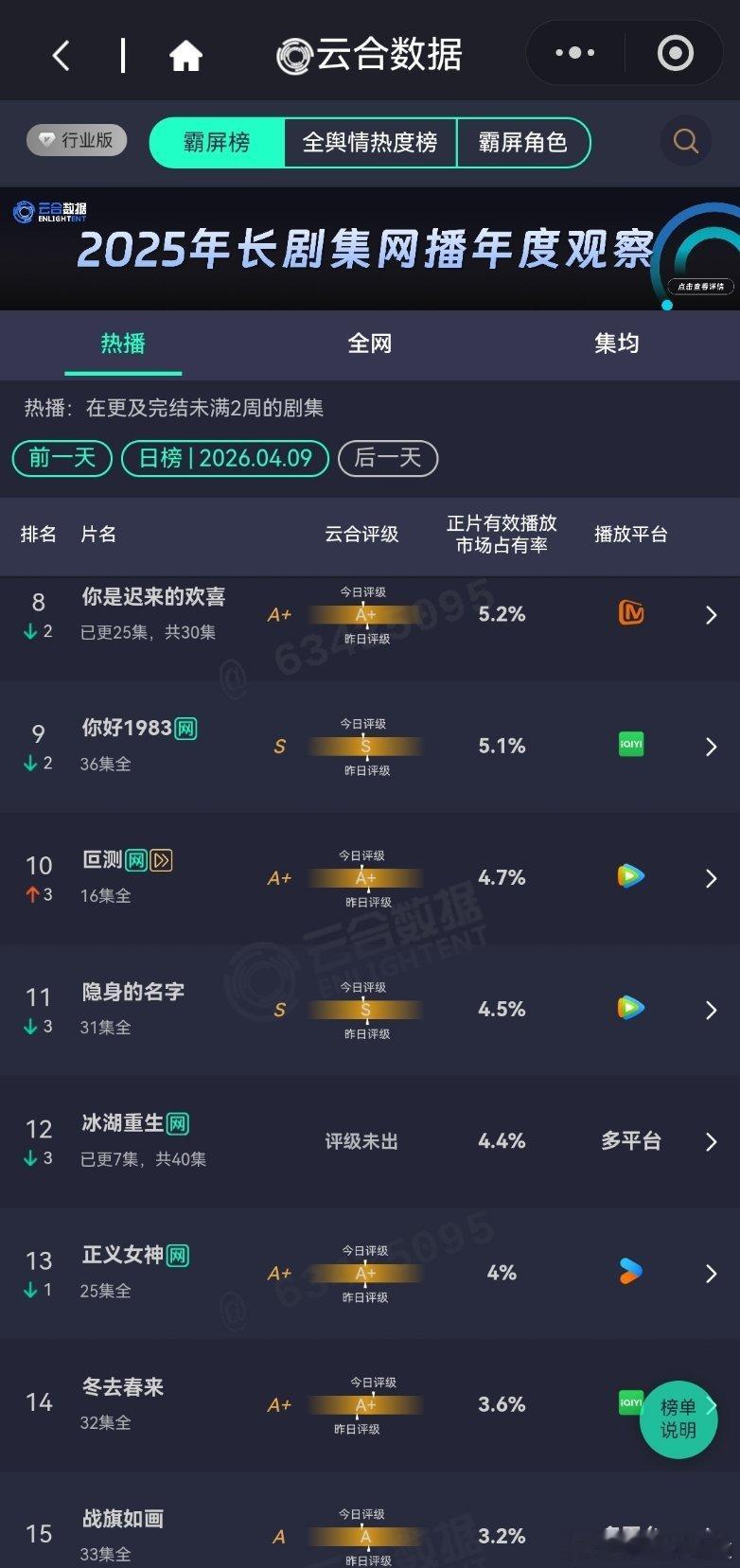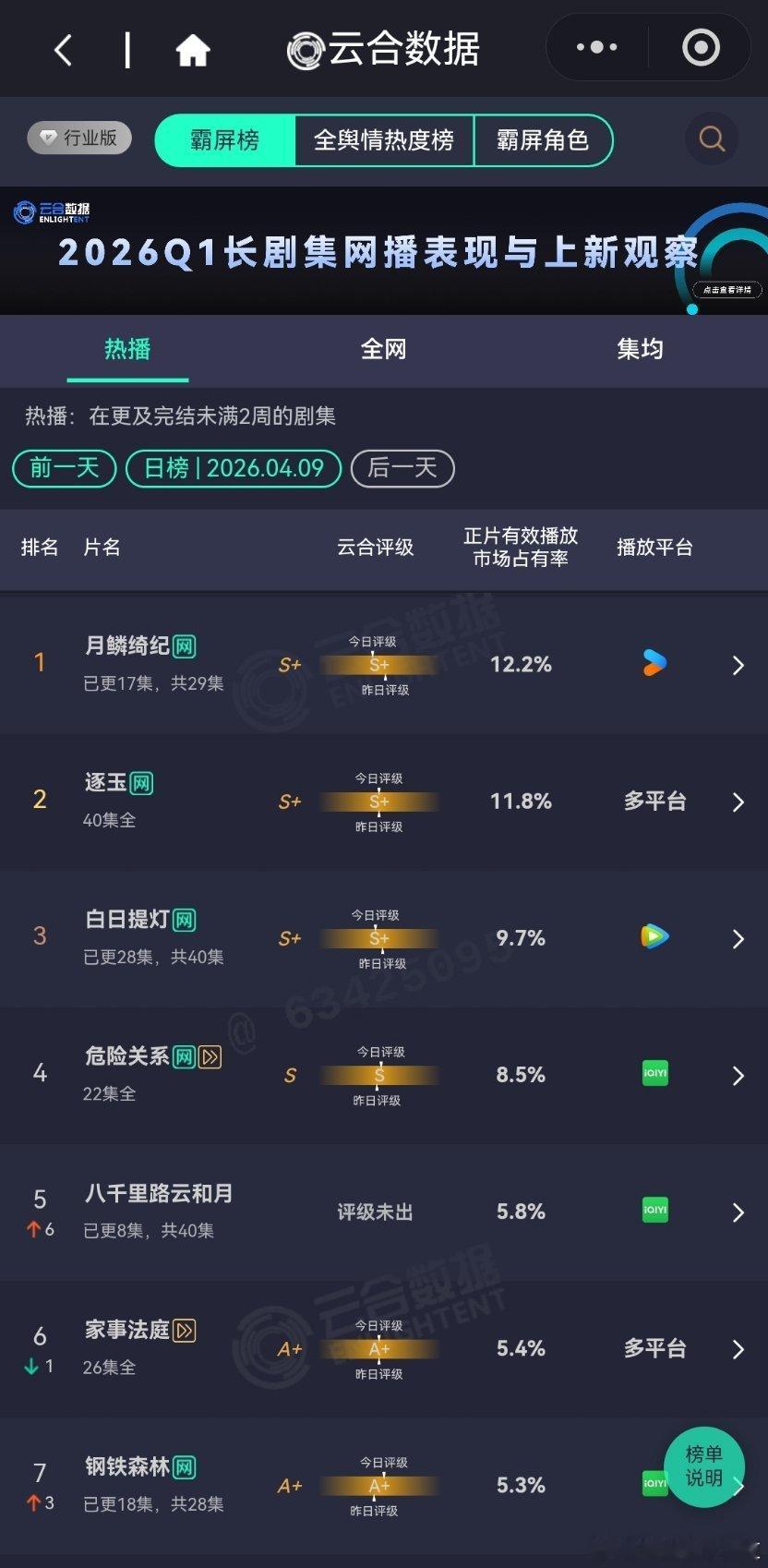 4月9日云合播放占比云合 VS酷云月鳞绮纪云合12.2%,酷云11.89%评级下降了一点白日提灯云合9.7%,酷云9.99%评级左移一直左移一直左移一直左移一直左移一直左移再次达成。八千里路云和月云合5.8%,酷云6.13%按照这个趋势,评级只有S冰湖重生云合4.4%,酷云5.48%张檬还得继续哭了。