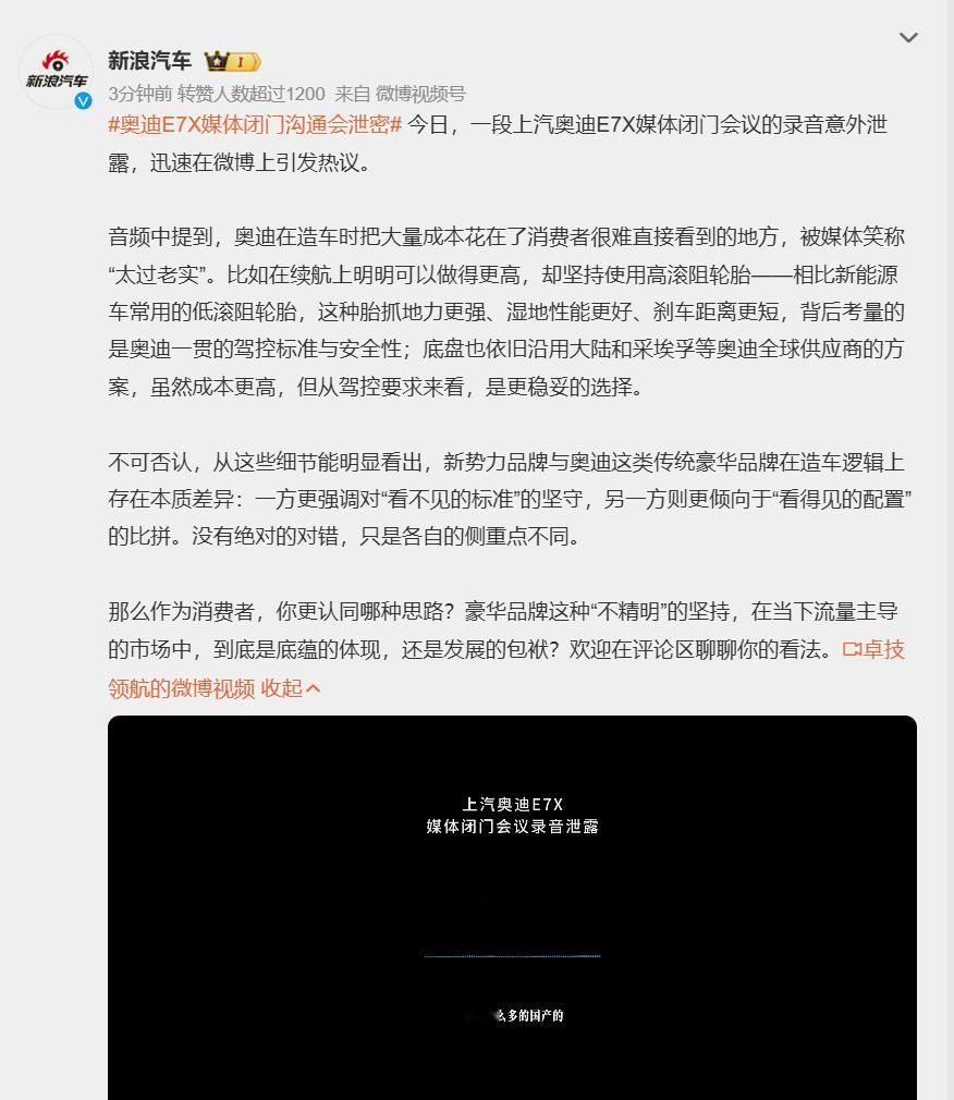 奥迪E7X媒体闭门沟通会泄密 我还以为是泄密了什么重要内容,结果是泄密了一条“产品亮点”。建议这样的闭门沟通会下次改成公开的形式,好东西多让大家都知道知道没毛病吧?