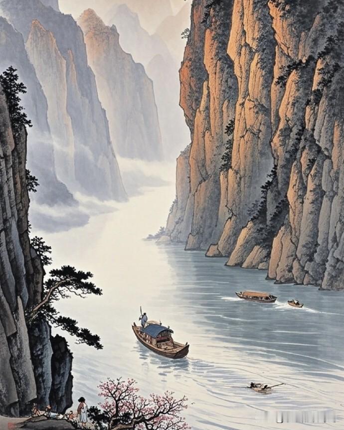 风浪虽然平息了,但江面上依然波光粼粼,阳光照射下闪耀着碎金般的光,船夫抬头看岸边的山峦,感觉山正朝着自己迎面走来。