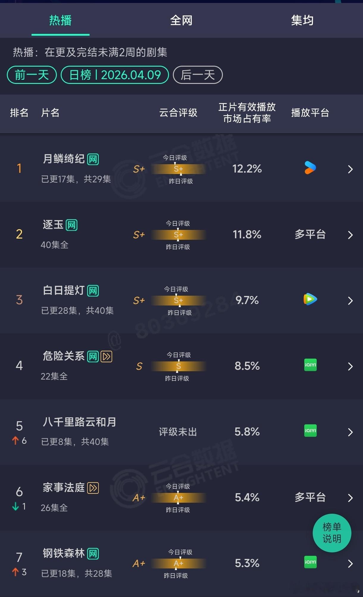 4月9日云合占比,没有一部剧超15%的,月鳞绮纪和白日提灯都是S+古装剧,一个1