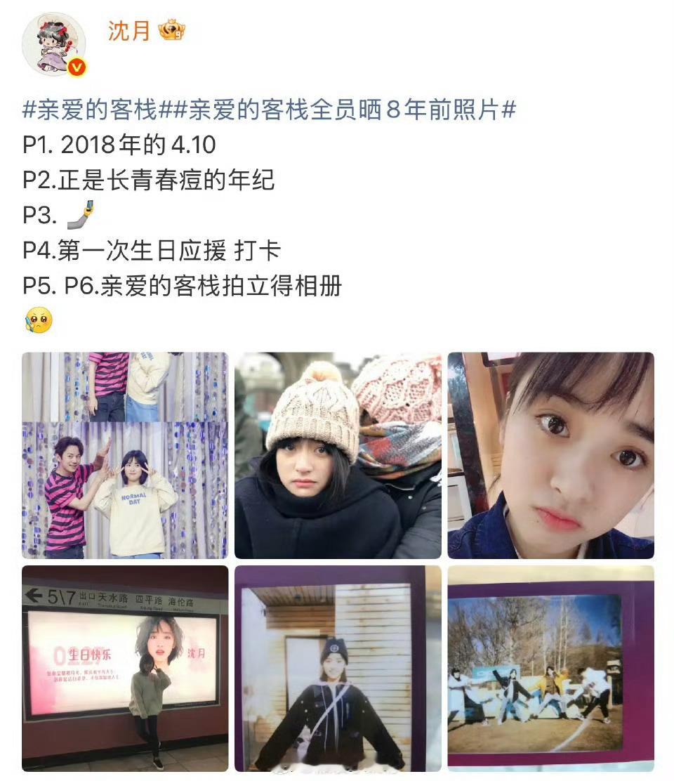 沈月晒8年前照片沈月通过个人微博发布6张2018年4月10日的旧照,包含素颜生活照、生日应援记录及《亲爱的客栈》拍立得相册。她配文提及当时"正是长青春痘的年纪",自嘲中透露真实感。