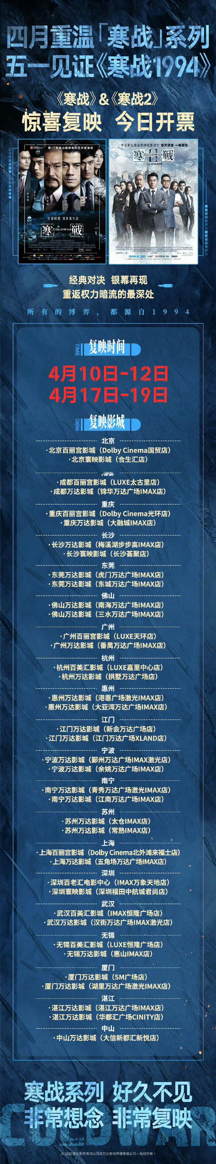 《寒战》系列前传电影《寒战1994》五一档上映,全国百老汇院线和万达院线的部分影城将在4月10-12日、4月17-19日两个周末重映2012年的《寒战》和2016年的《寒战2》!我在微博聊电影
