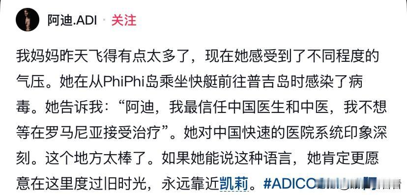 阿迪发文也是在说,妈妈她很信任中国的中医,她不要等到罗马尼亚去治疗了,如果她会中国的语言,愿意在这里度过,这样就可以靠近凯莉多些。