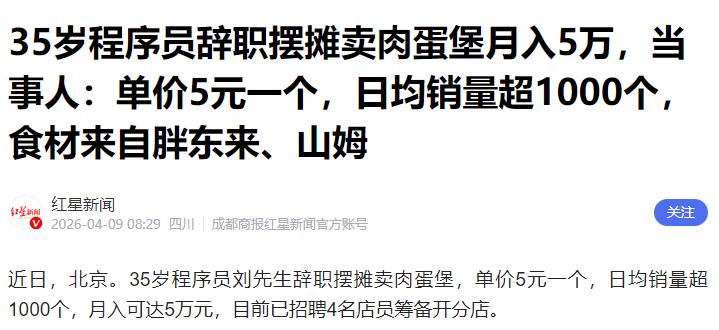 “万万没想到!”北京,一程序员因工作压力大,选择辞职,他没有继续干同一行的工作,反而开始摆摊,卖起了自己爱吃的肉蛋堡,没想到生意火爆,5块钱一个的东西,却让他月入5万左右,并且越做越大,都准备开分店了!网友:条条大路通罗马!