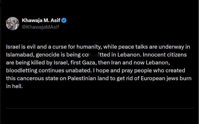 巴基斯坦防长哈尔贾.阿西天今天(4月10)怒怼以色列:“以色列是人类的邪恶与诅咒。当伊斯兰堡正在举行和平谈判时,黎巴嫩却在发生种族灭绝。以色列在杀害平民:先是加沙,然后是伊朗,现在是黎巴嫩,这场流血冲突从未停止。我希望并祈祷,那些为了摆脱欧洲犹太人而在巴勒斯坦土地上建立的这个癌症般国家的人,在地狱中燃烧。”
