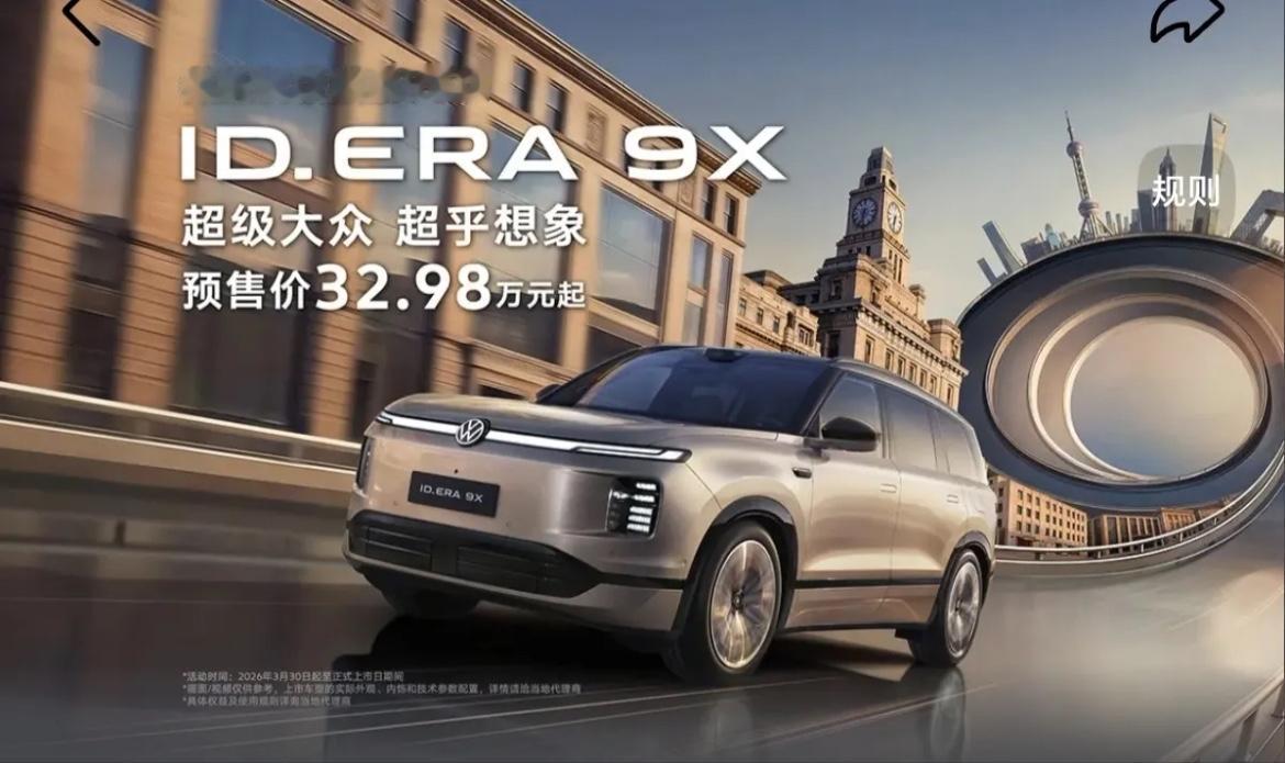 上汽大众ID.ERA 9X的预售政策一出来,我直接原地拍手叫好!32.98万起的价格,全尺寸+增程,把空间和续航做扎实,这哪是卖车,分明是带着诚意来给大家送惊喜的。