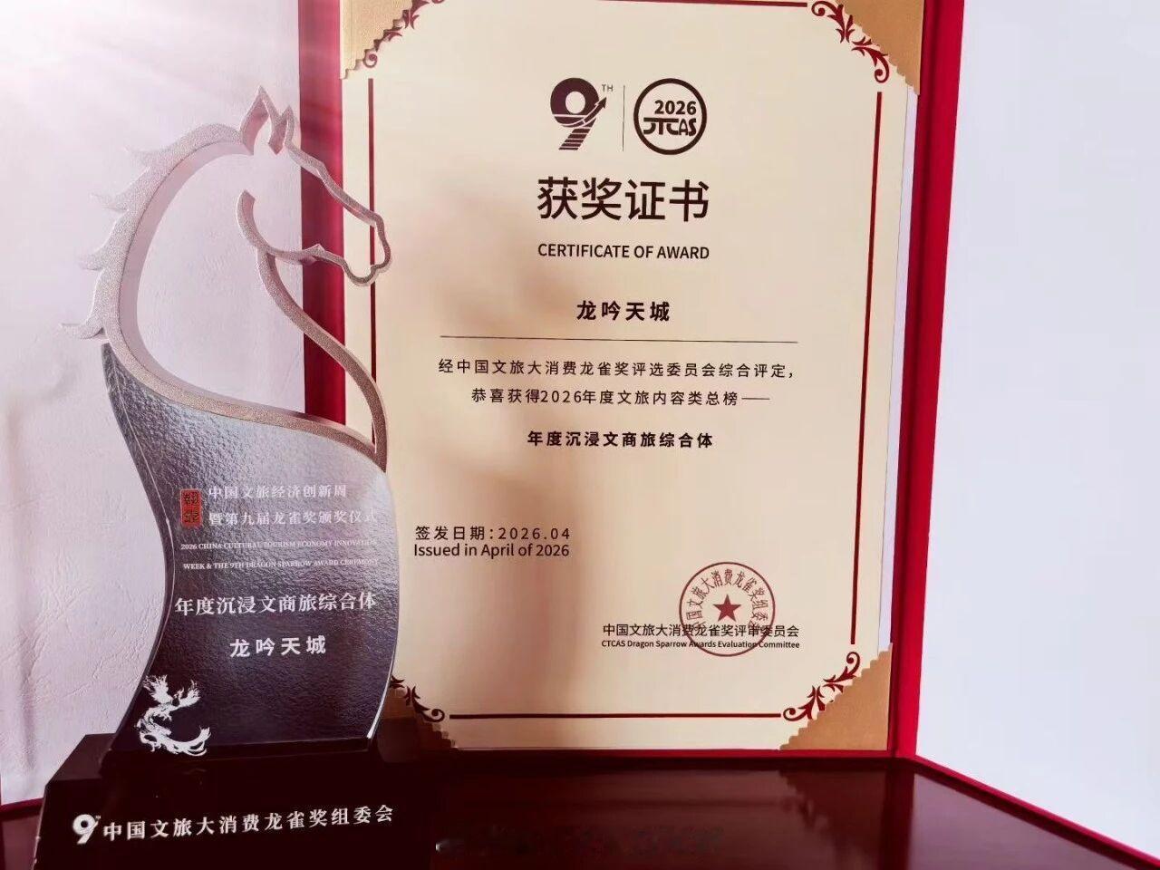 《水龙吟》衍生文旅项目龙吟天城获得第九届文雀奖「年度沉浸文商旅综合体」恭喜罗云熙