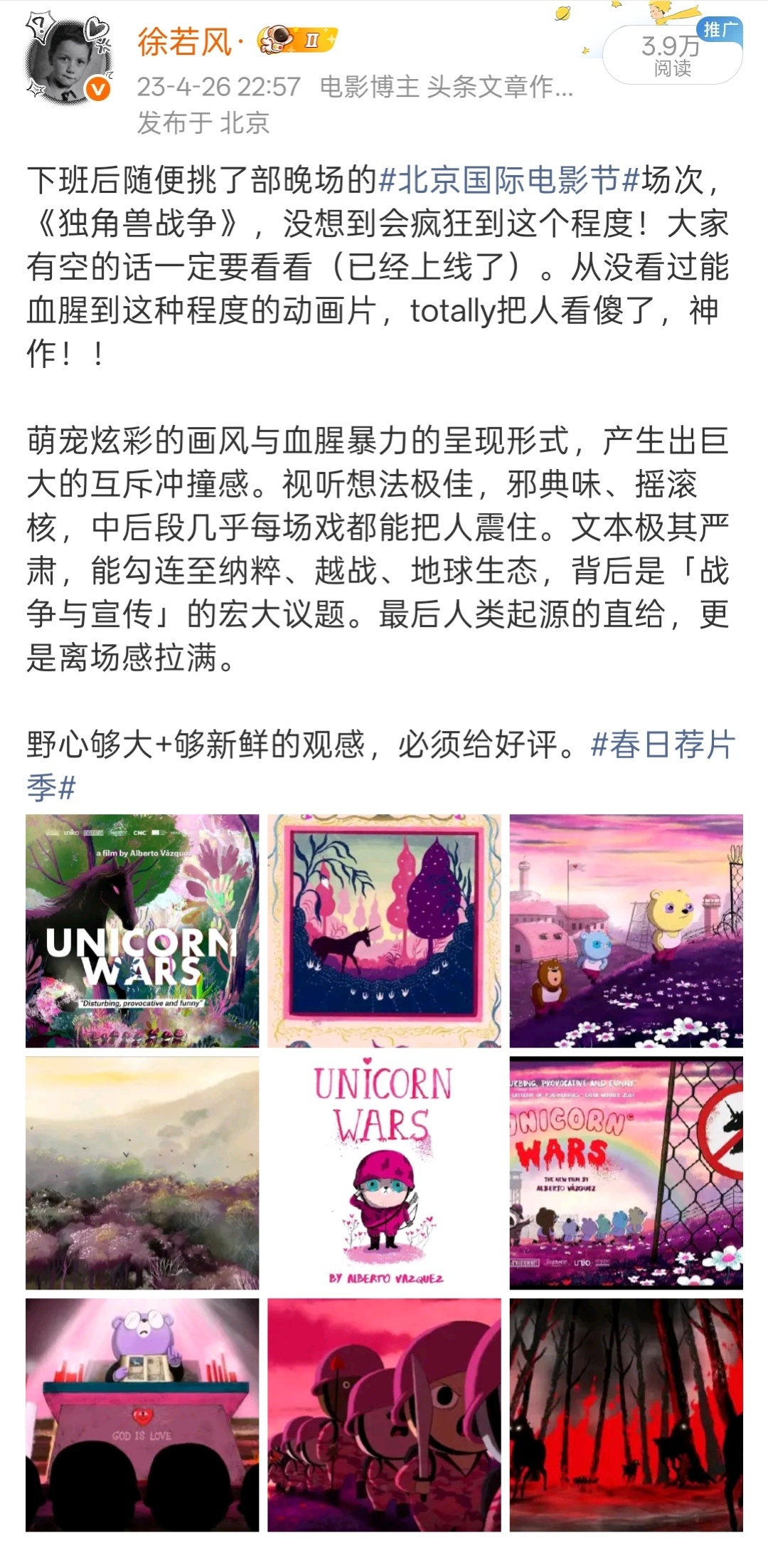 想说,今年北京国际电影节 我最期待的电影其实是这部:《楚门之鼠》。因为3年前曾在北影节开过导演上一部《独角兽》的“盲盒”,惊为天人...非常黑暗、恐怖惊悚风格的成人动画。没想到时隔3年,新作又来北影节了,豆瓣清一色四五星,必看。目前所有场次均未售完。