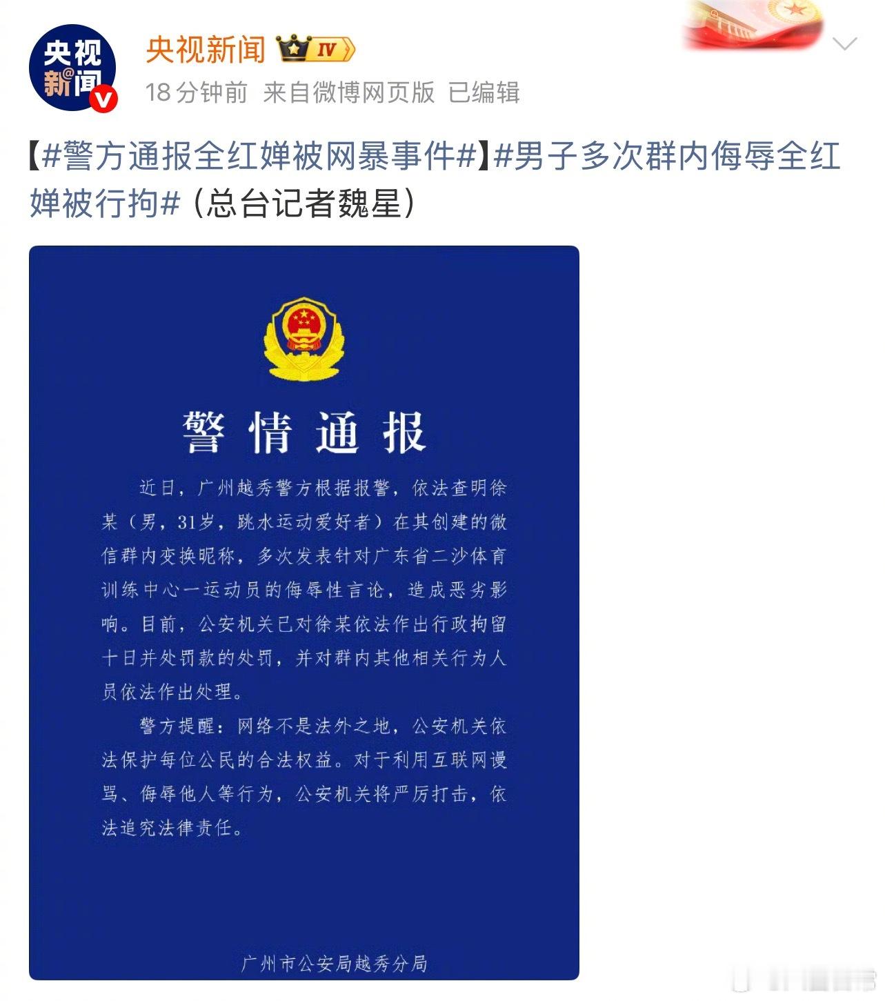 男子在其创建的群里多次发表针对全红婵的侮辱性言论被行拘