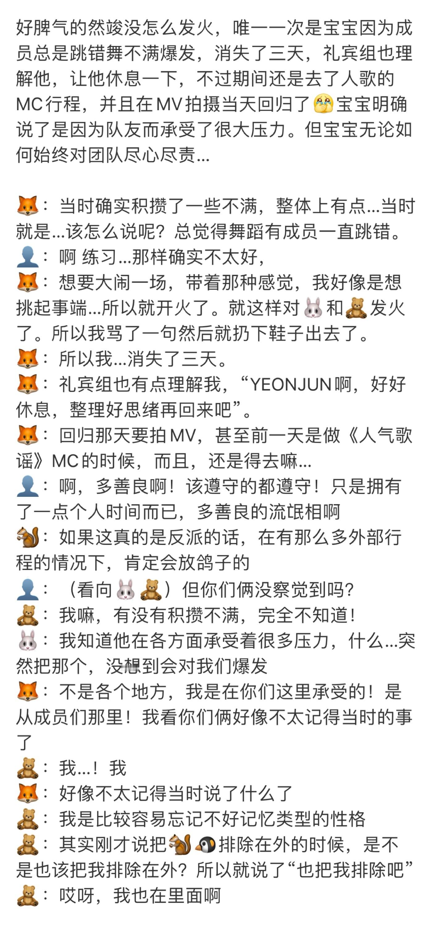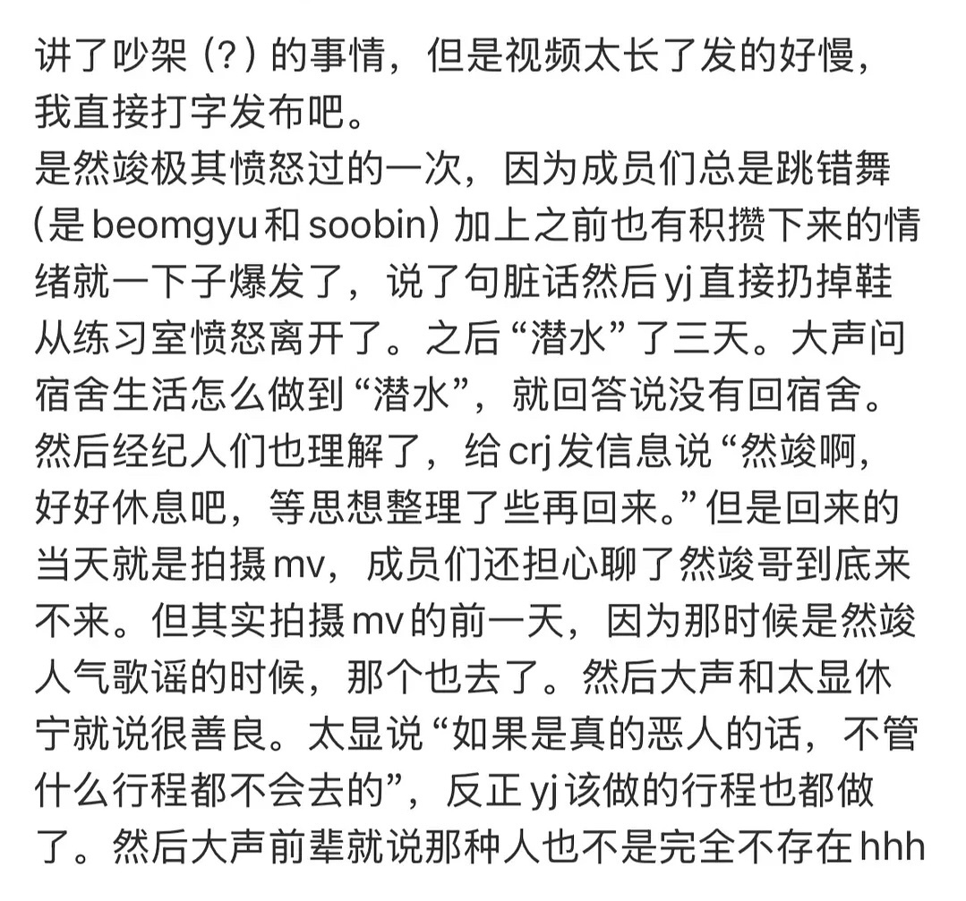 TXT新综艺提及成员吵架事件崔然竣因为崔秀彬、崔杋圭频繁跳错舞蹈不满,从练习室愤怒离开消失了三天,mv拍摄当天回归了