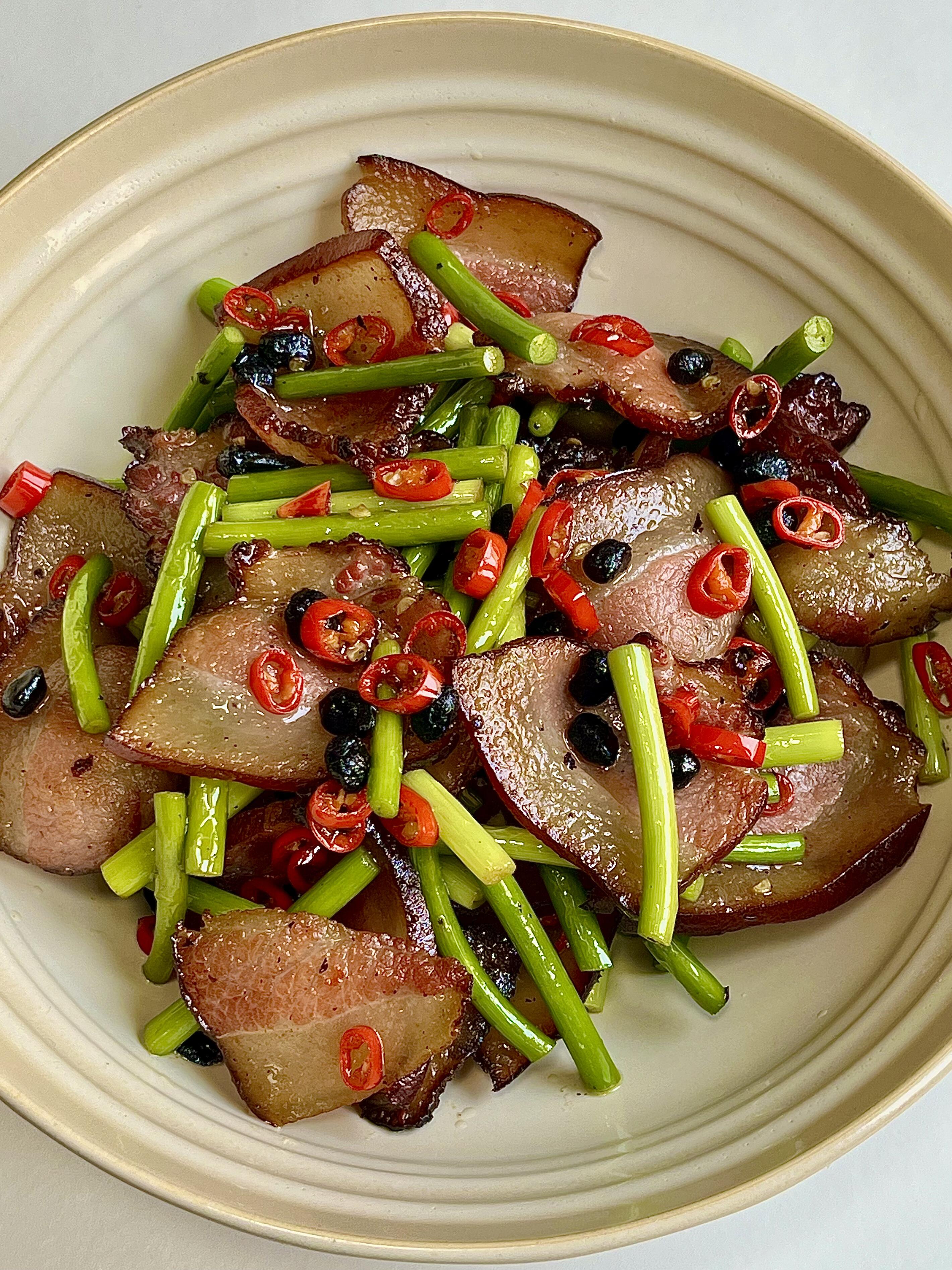 2)热锅不用倒油,直接放入腊肉片,小火慢慢煸炒出油脂,把多余的油脂倒出来(不腻更清爽);接着放入小米辣圈和豆豉,煸出香味,再倒入蒜苔段,大火煸炒几下,加1勺生抽,翻炒均匀,立马关火出锅!
