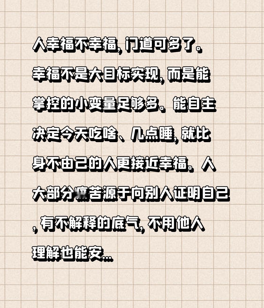 人幸福不幸福,门道可多了。幸福不是大目标实现,而是能掌控的小变量足够多。能自主决定今天吃啥、几点睡,就比身不由己的人更接近幸福。